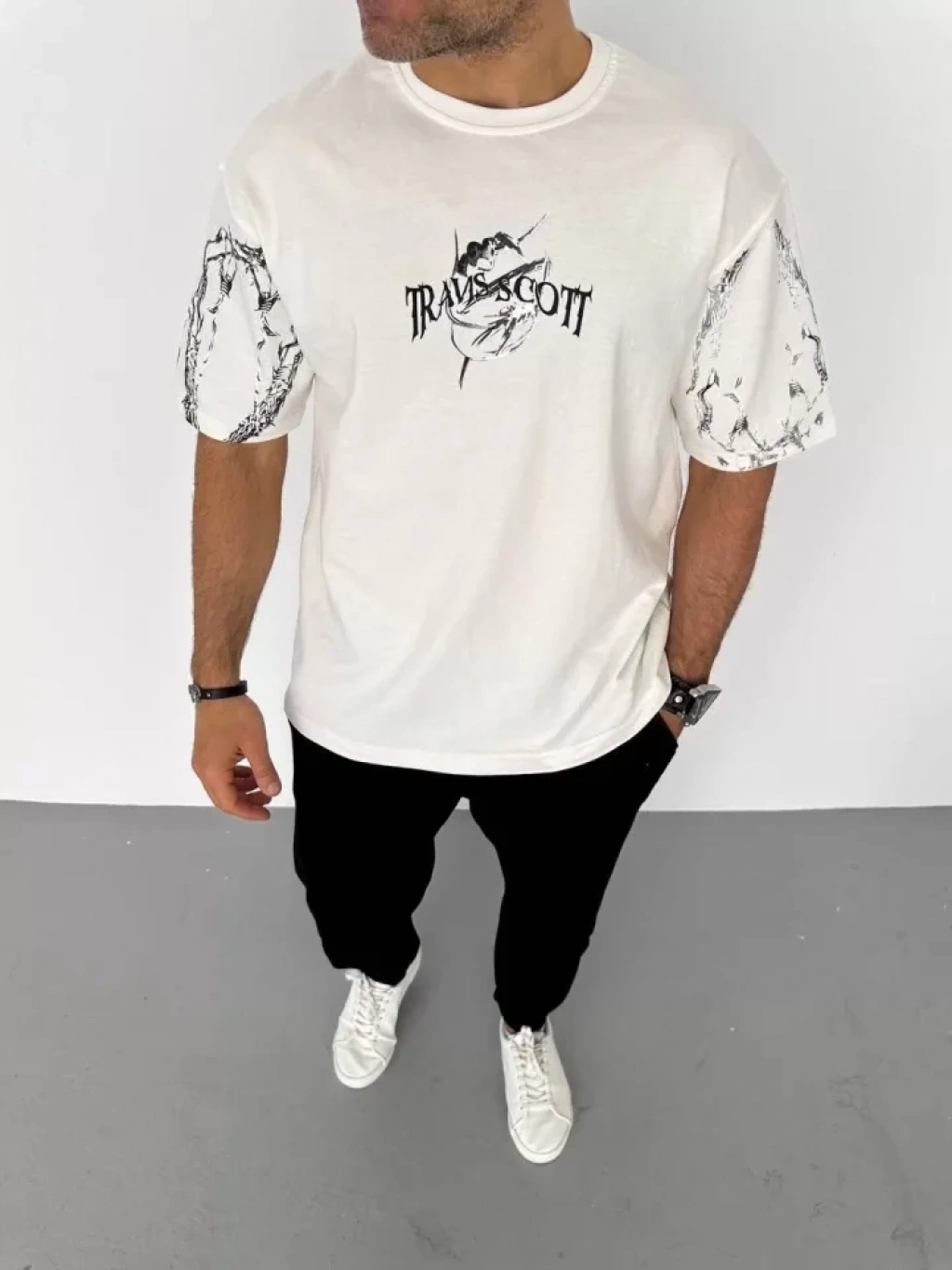 Erkek Asit Yıkama Bisiklet Yaka Kısa Kollu Oversize Thirt Tişört Beyaz