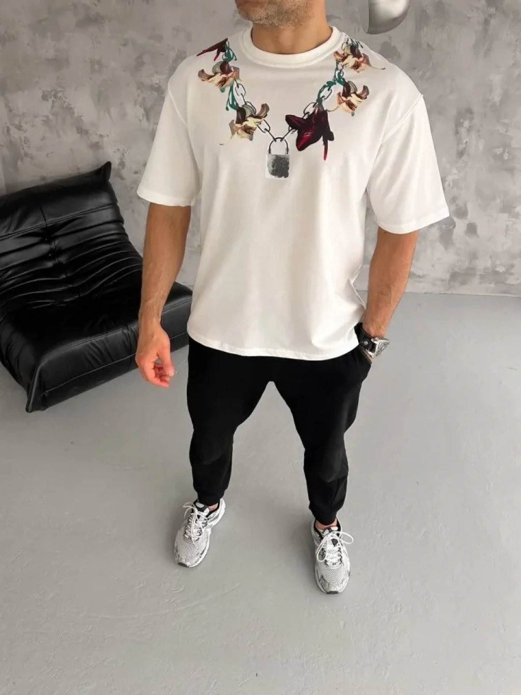 Unisex Bisiklet Yaka Baskılı Oversize Thirt Beyaz