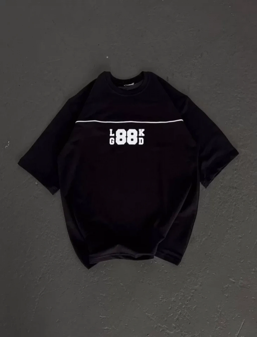 Unisex Bisiklet Yaka Baskılı Oversize T-Shirt - Siyah