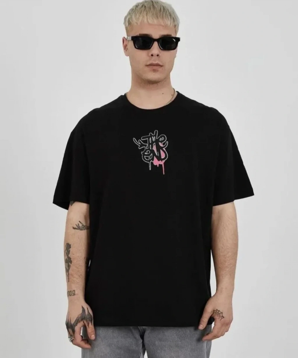 Unisex Bisiklet Yaka Baskılı Oversize T-Shirt - Siyah