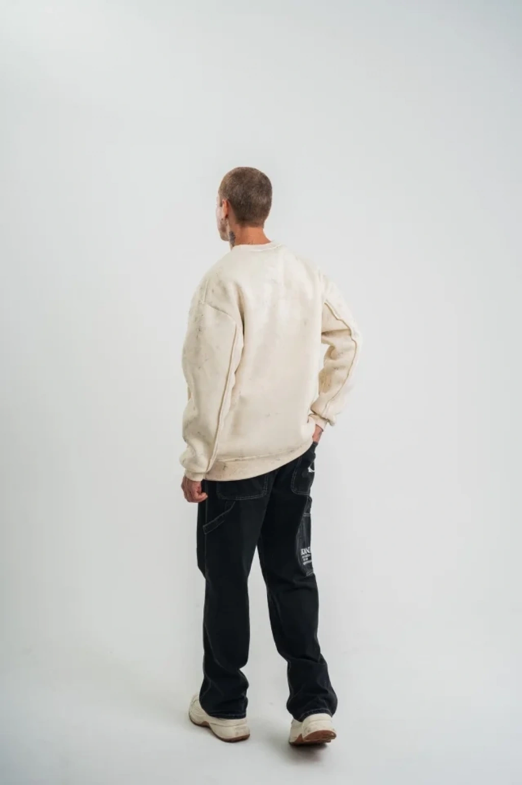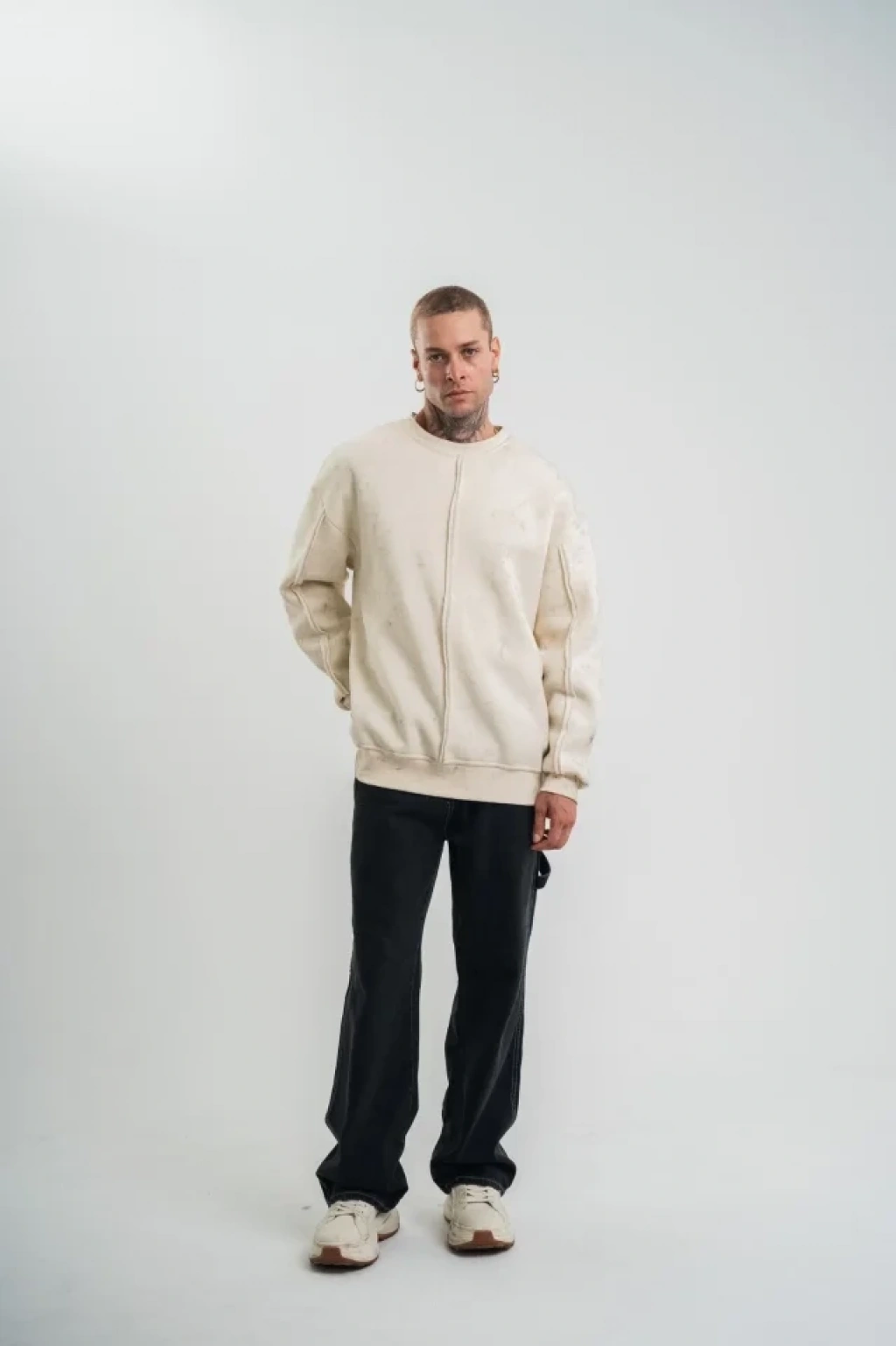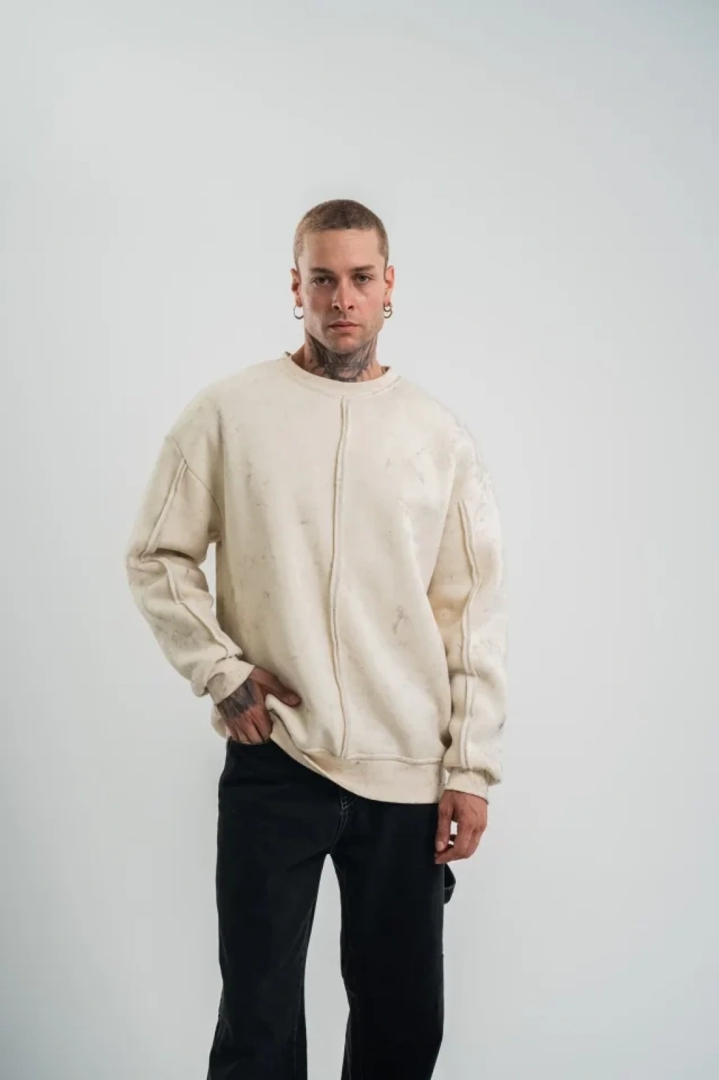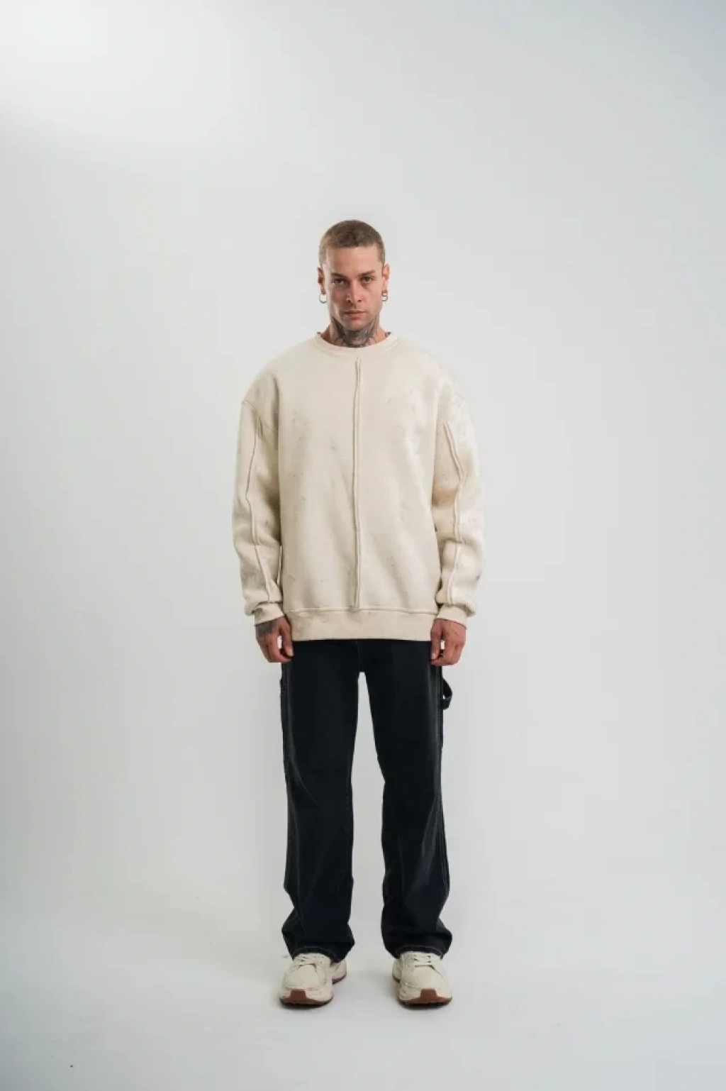 Unisex Bisiklet Yaka Özel Pis Dikişli Yıkamalı SweatShirt - Bej
