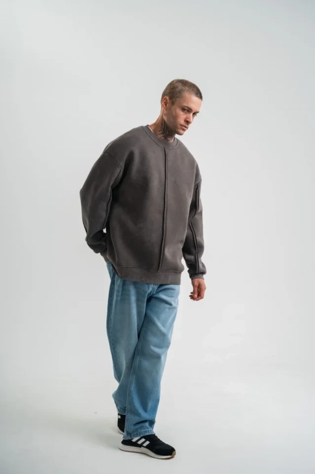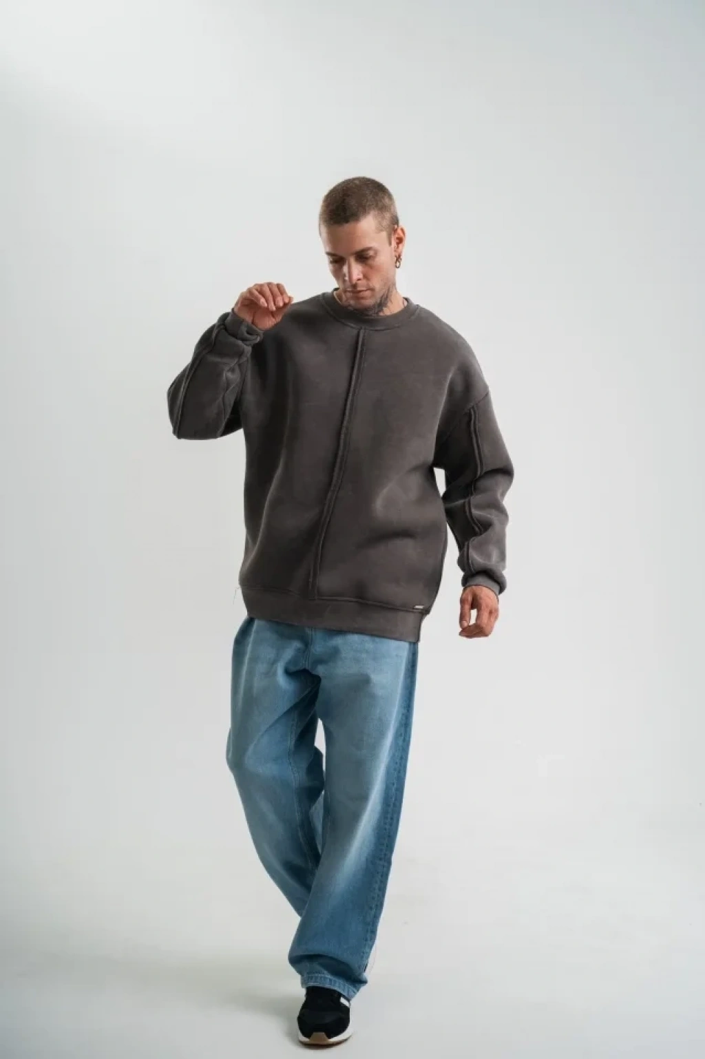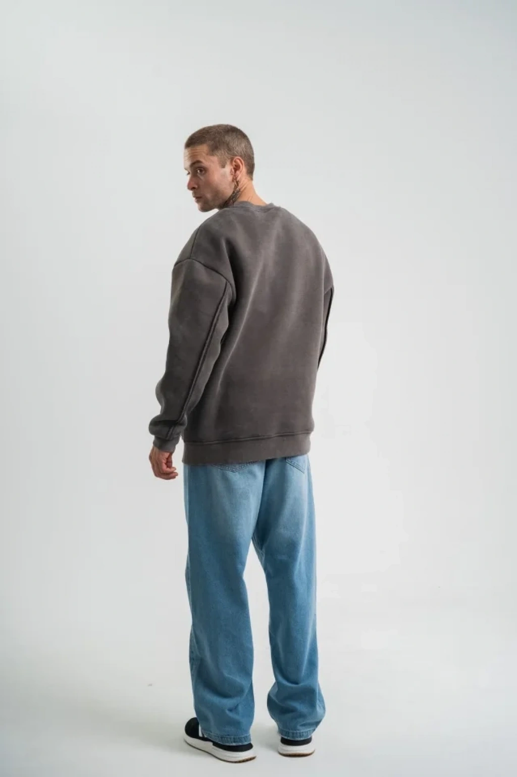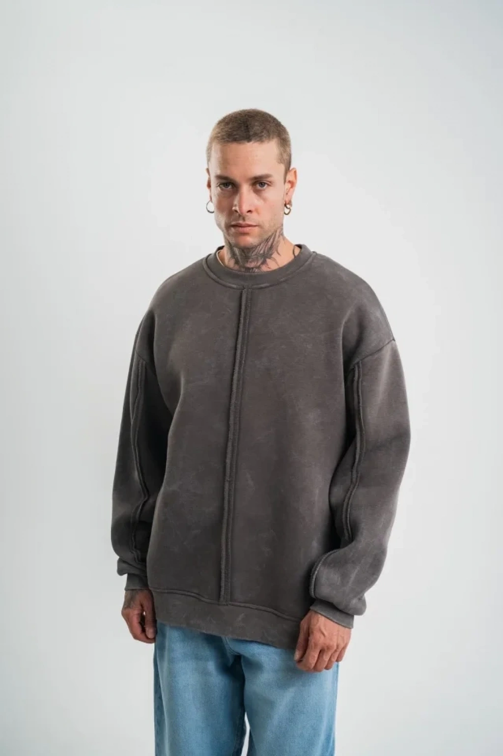 Unisex Bisiklet Yaka Özel Pis Dikişli Yıkamalı SweatShirt - Füme