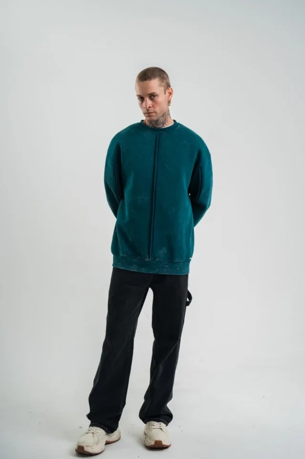 Unisex Bisiklet Yaka Özel Pis Dikişli Yıkamalı SweatShirt - Koyu Deniz Yeşili