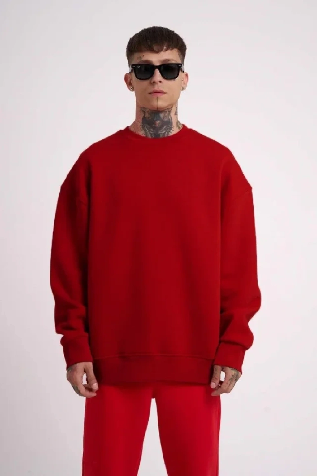 Unisex Biskilet Yaka Üç İplik weathirt Kırmızı