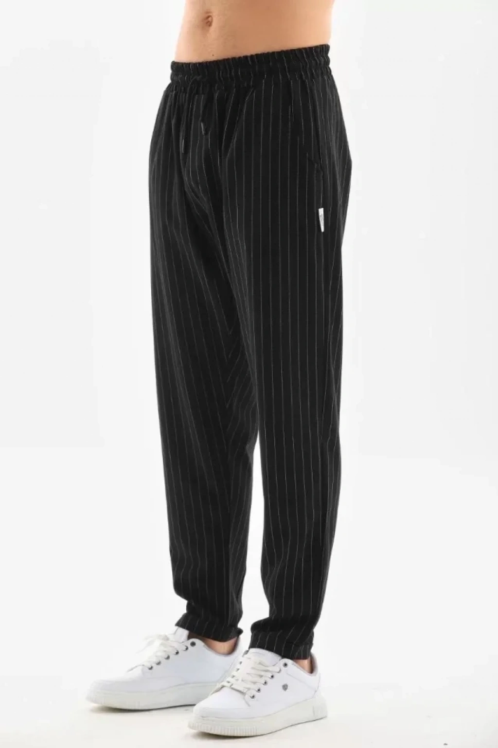 Erkek Üç İplik Kışlık Pamuklu Yandan Garneli Kalın Şeritli Cepli Eşofman Altı iyah