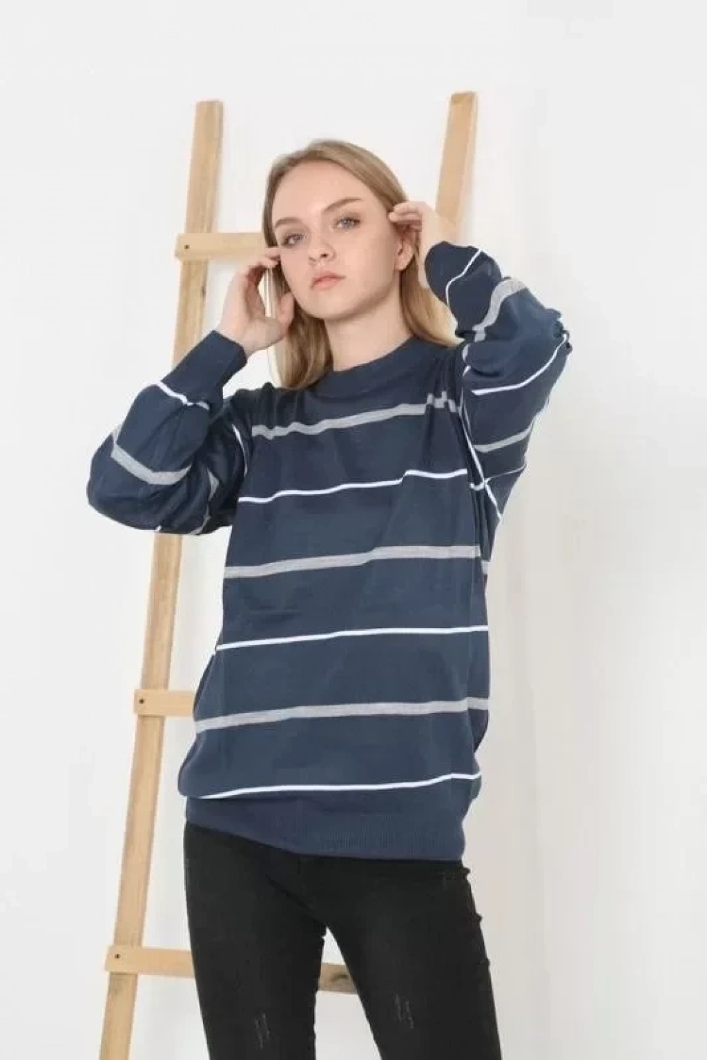 Unisex İnce Çizgili Bisiklet Yaka Triko Kazak - Lacivert