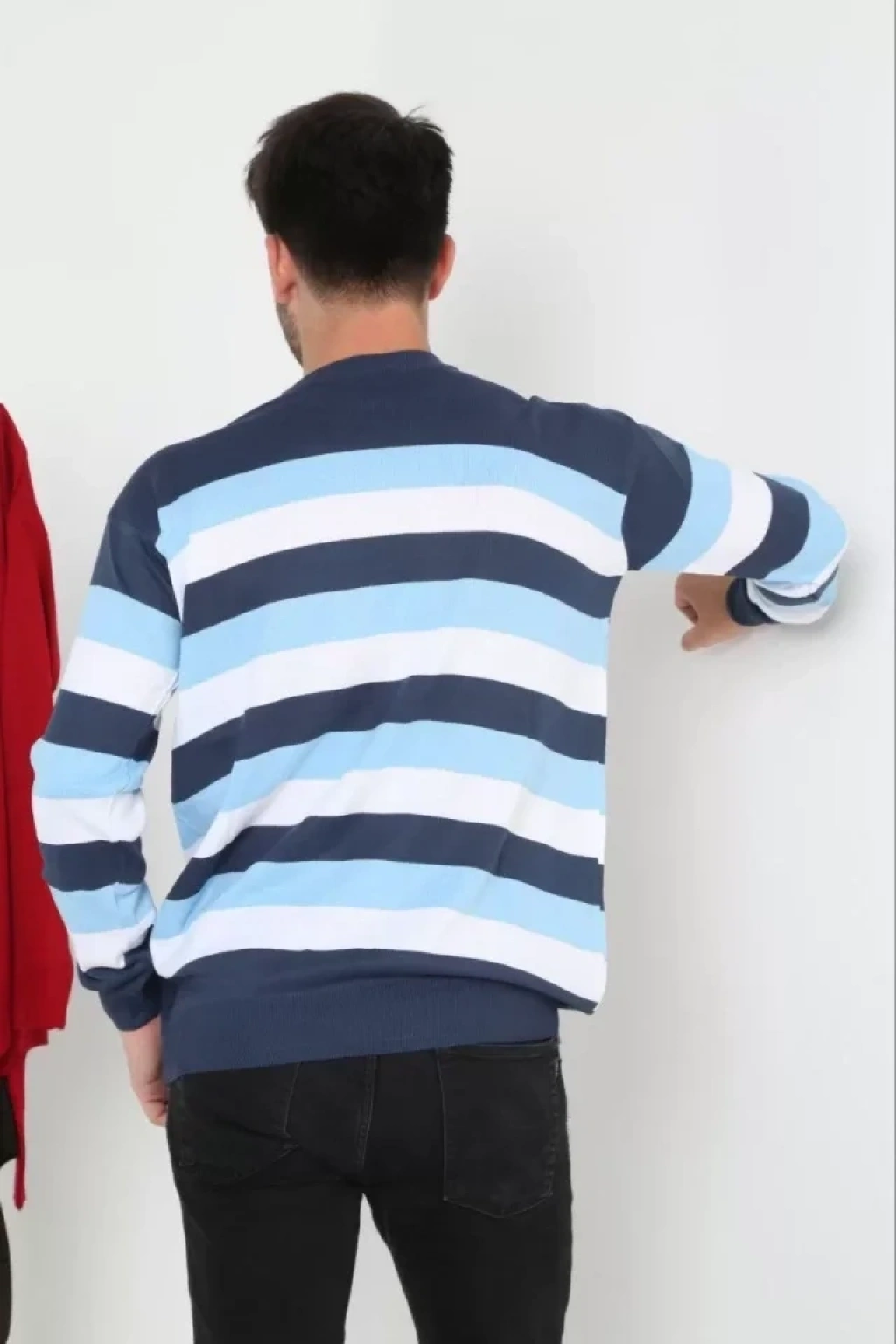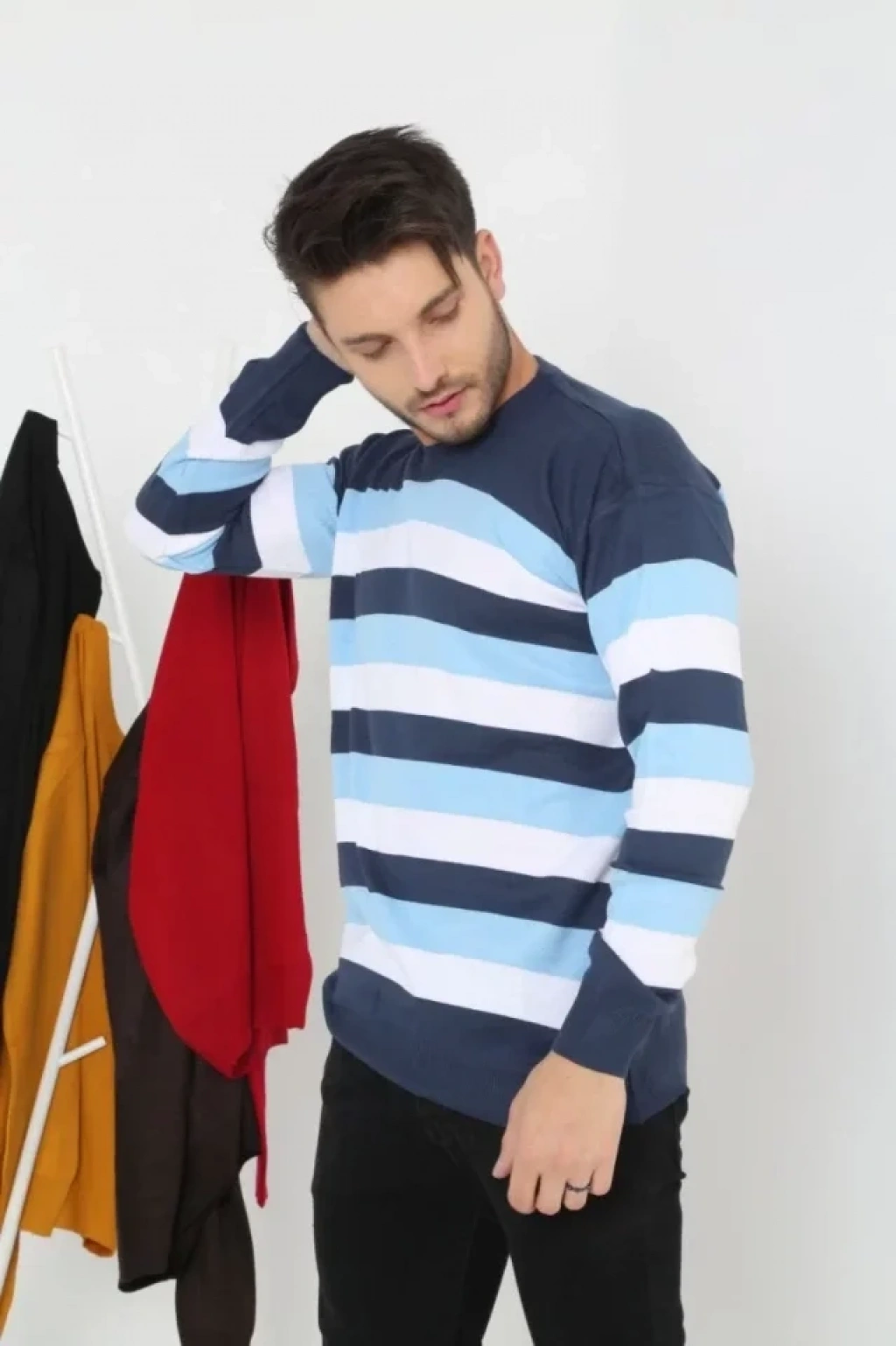 Unisex Kalın Çizgili Bisiklet Yaka Triko Kazak avi