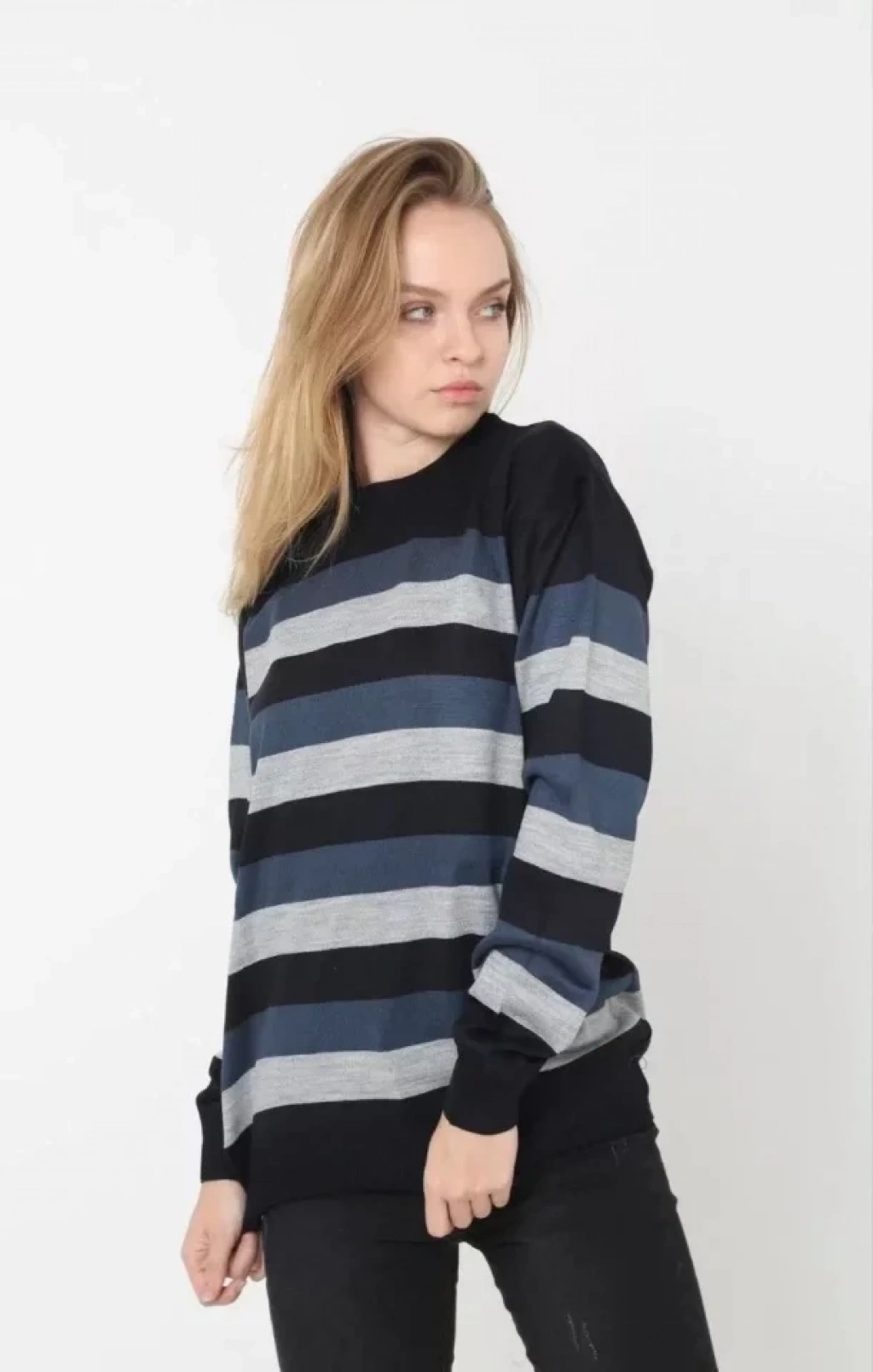 Unisex Kalın Çizgili Bisiklet Yaka Triko Kazak - Siyah