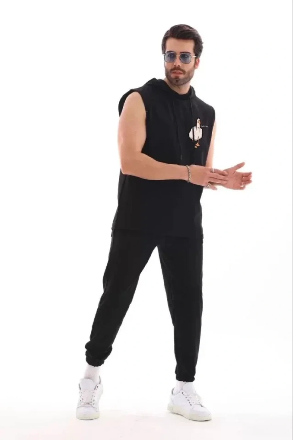 Unisex Kapşonlu Kolsuz Oversize Baskılı Tişört - Siyah