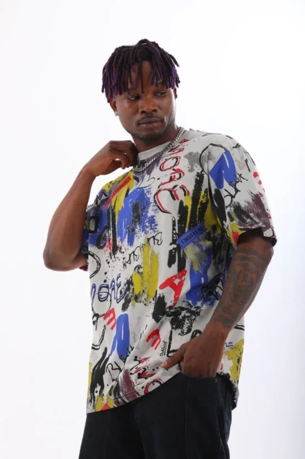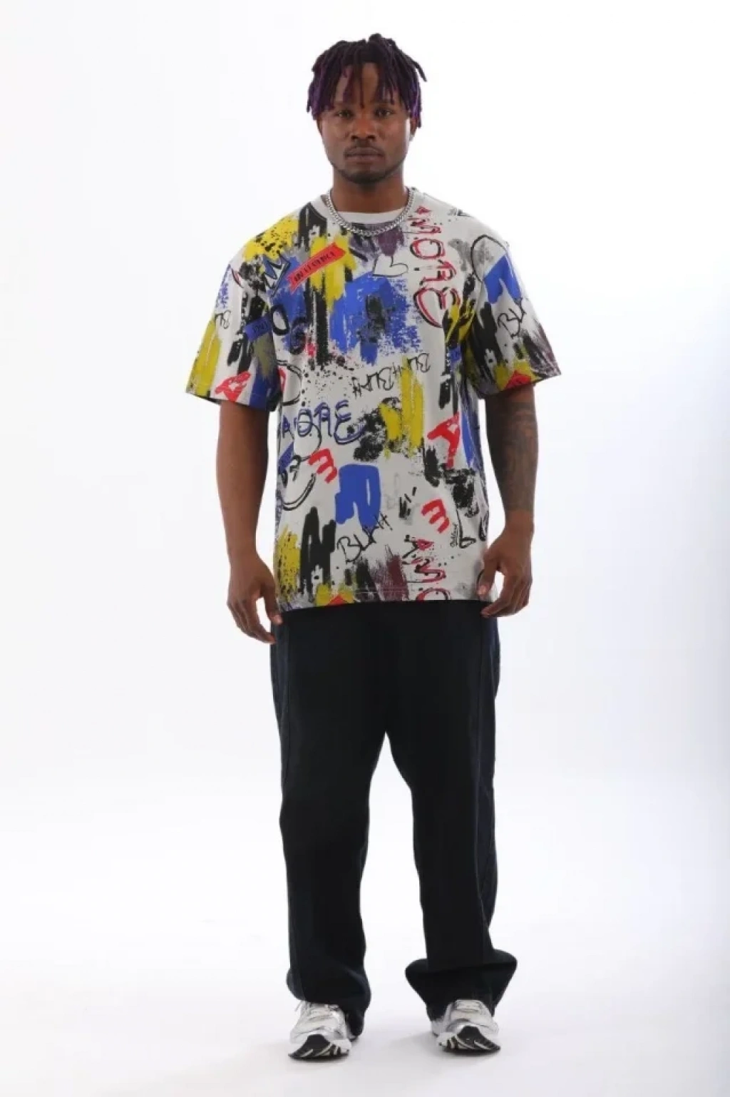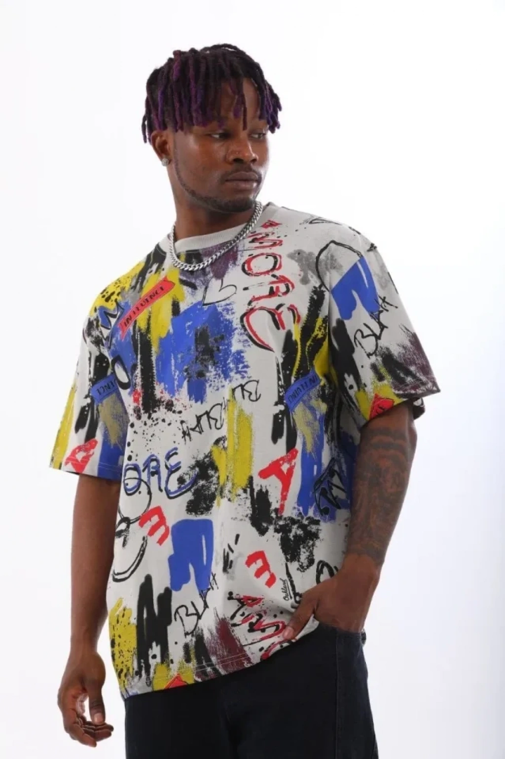 Erkek ırt Baskılı Oversize Tshirt Bej