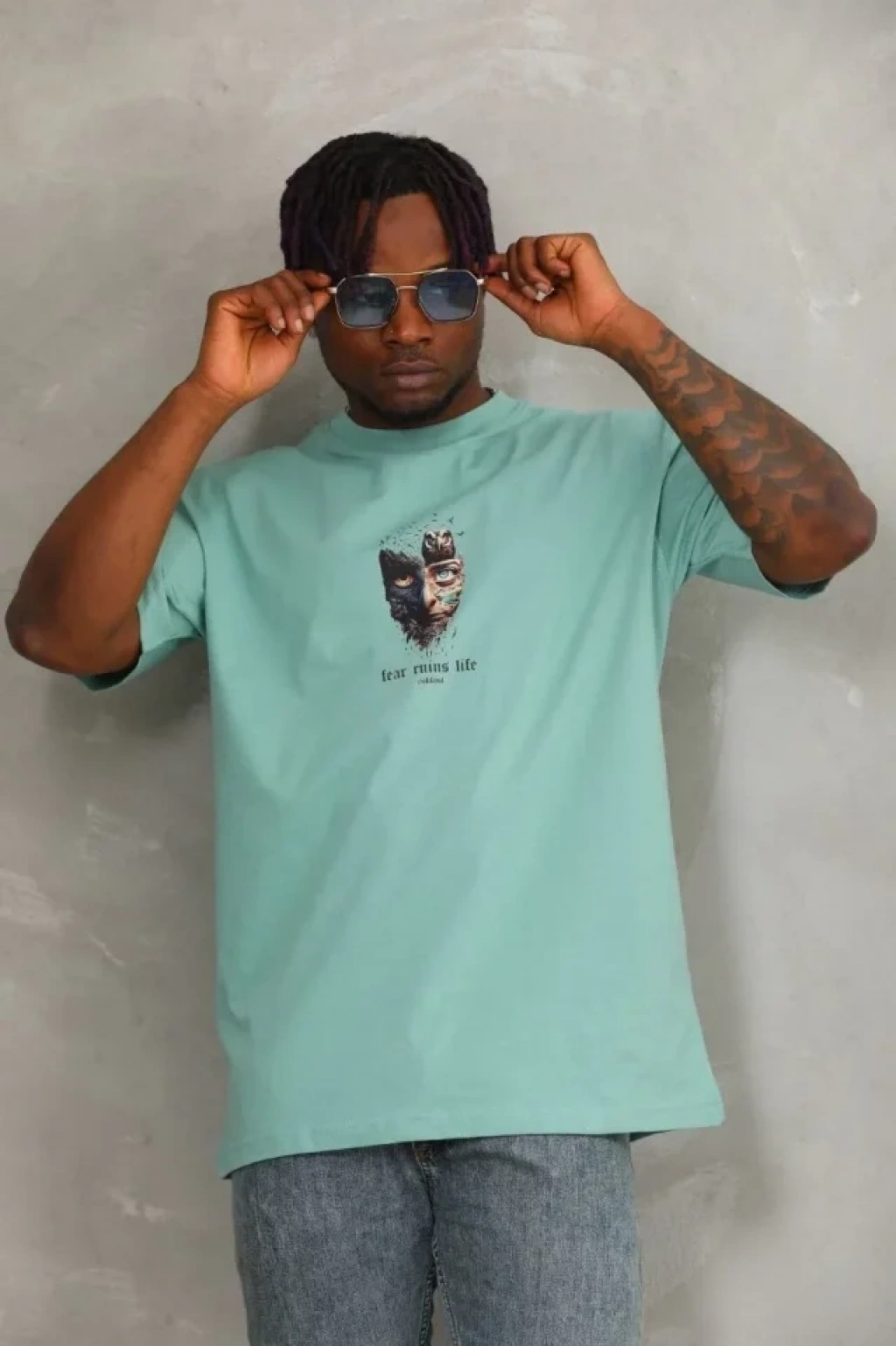 Unisex Oversize Baskılı Bisiklet Yaka T-Shirt - Mint Yeşili
