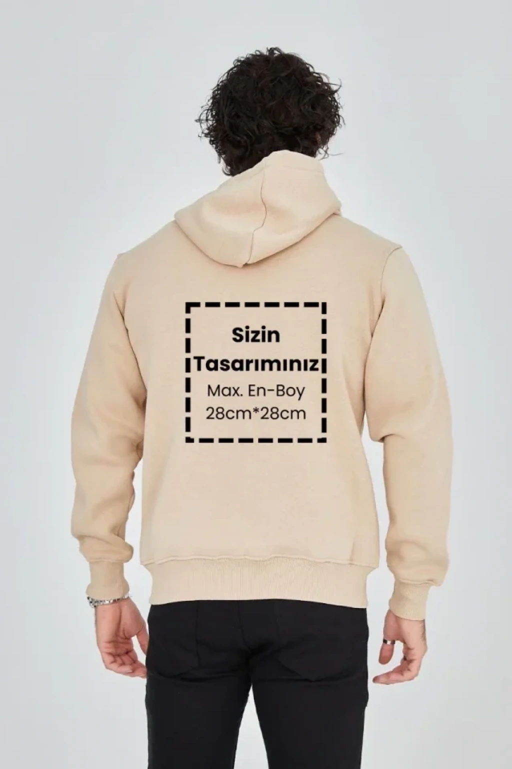 Unisex Tam Fermuarlı Kapşonlu Özel Tasarım SweatShirt - Bej