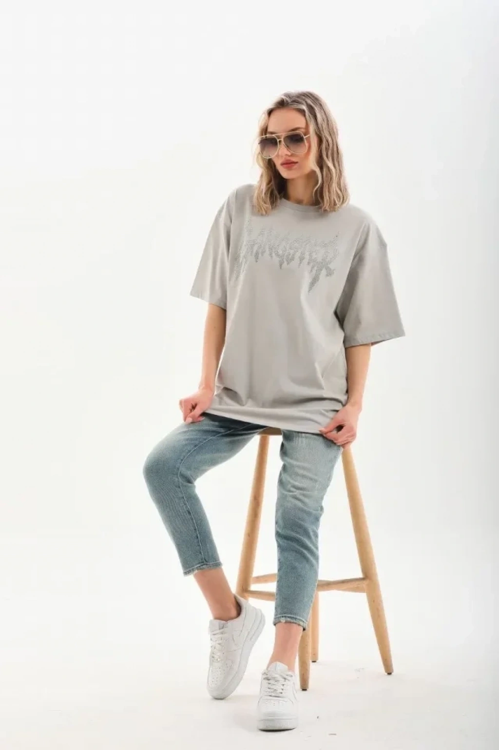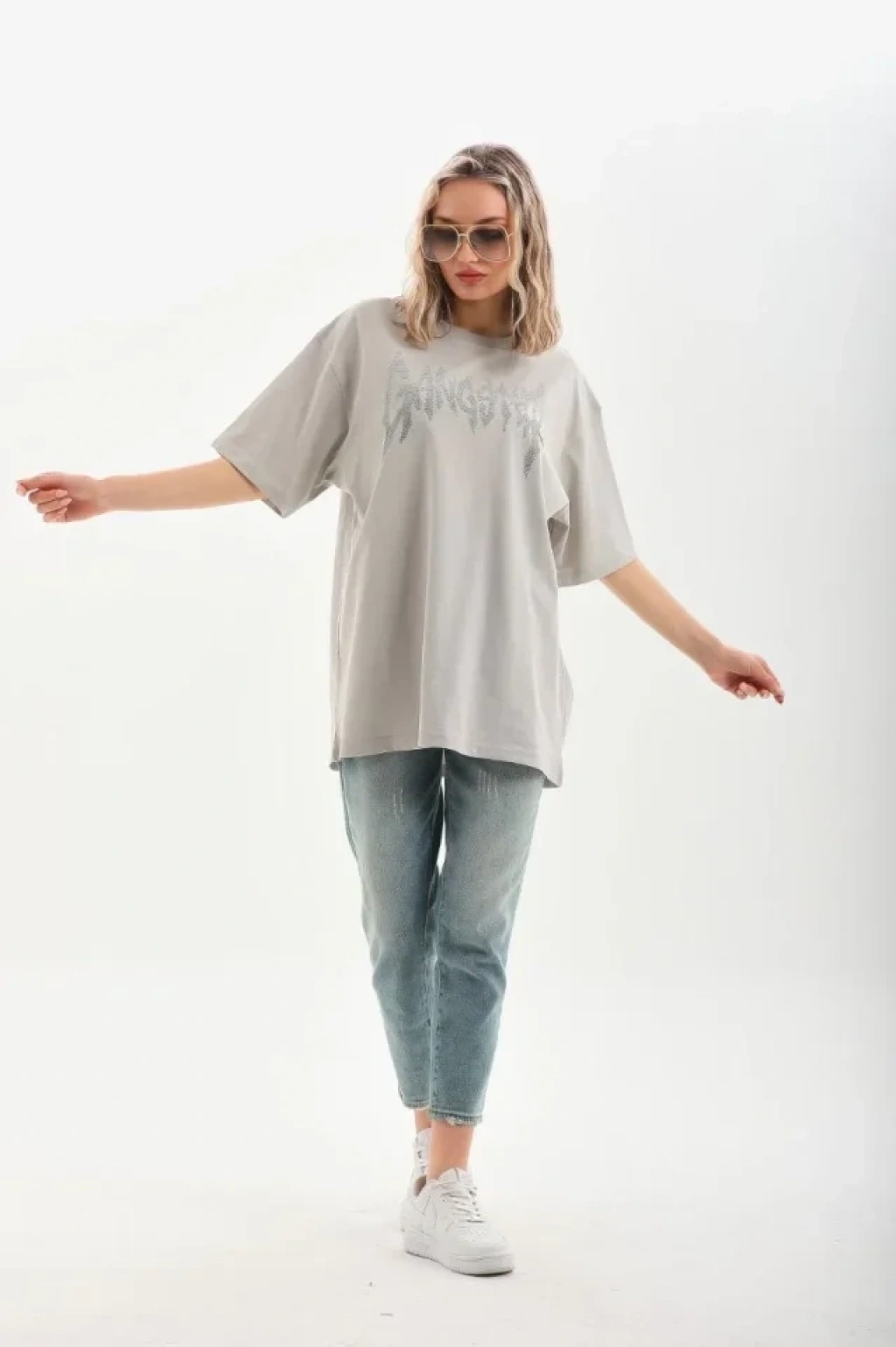 Unisex Taş Desenli Oversize T-Shirt - Gri
