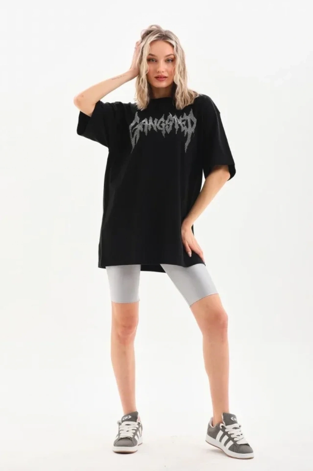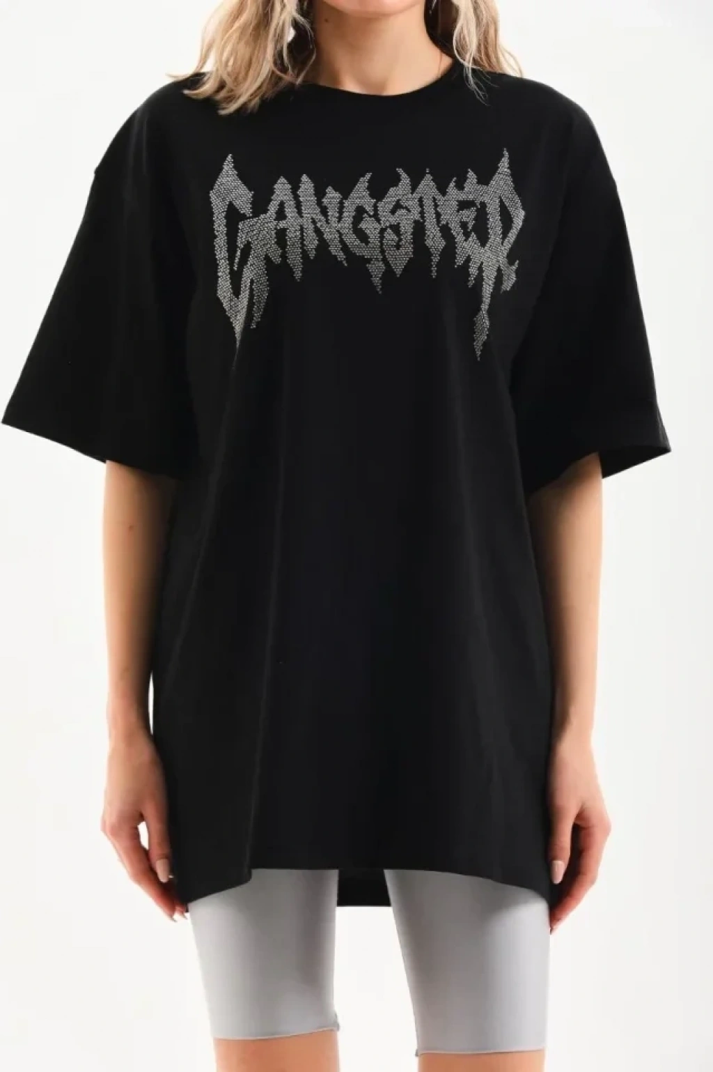 Unisex Taş Desenli Oversize T-Shirt - Siyah