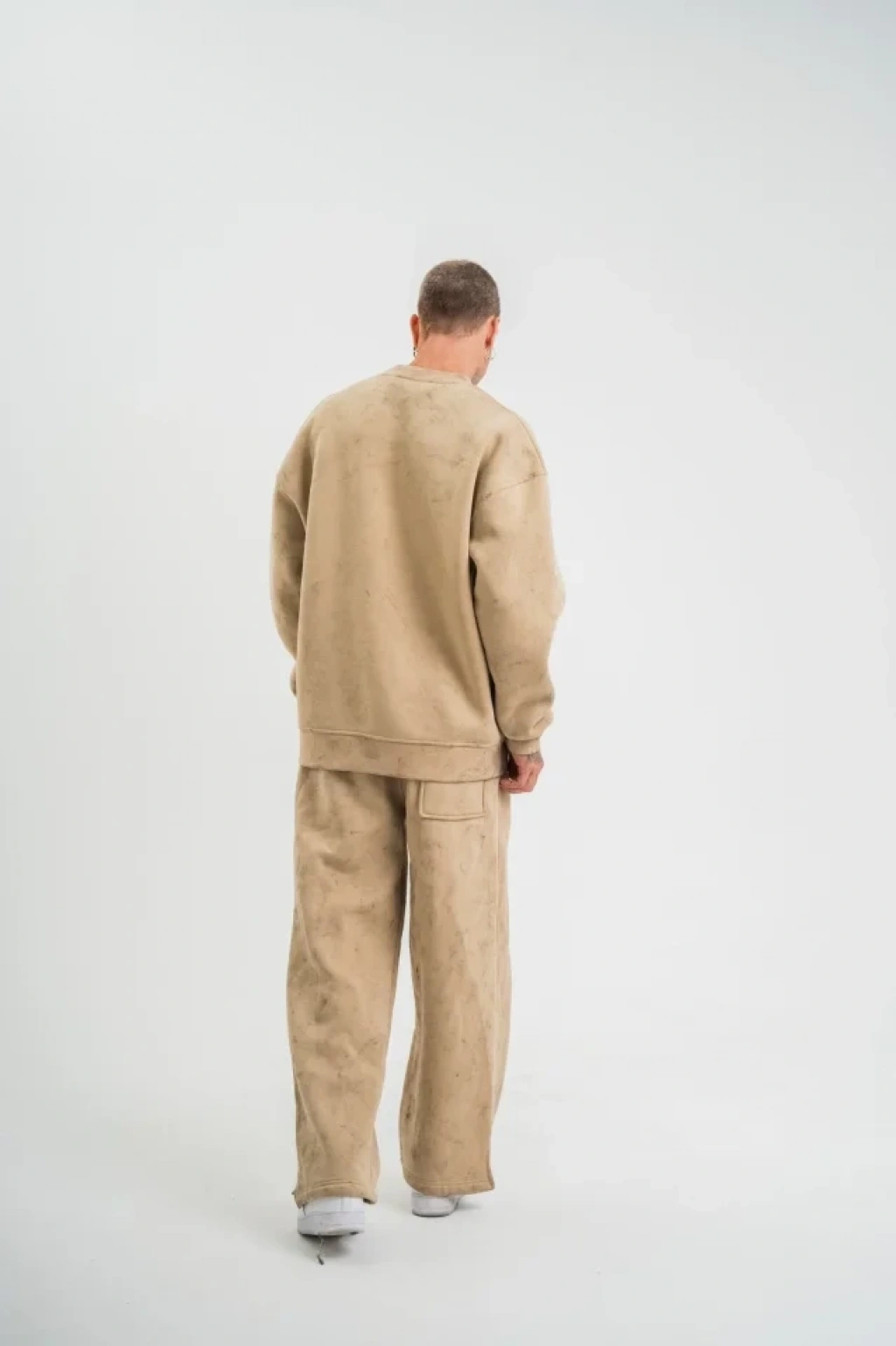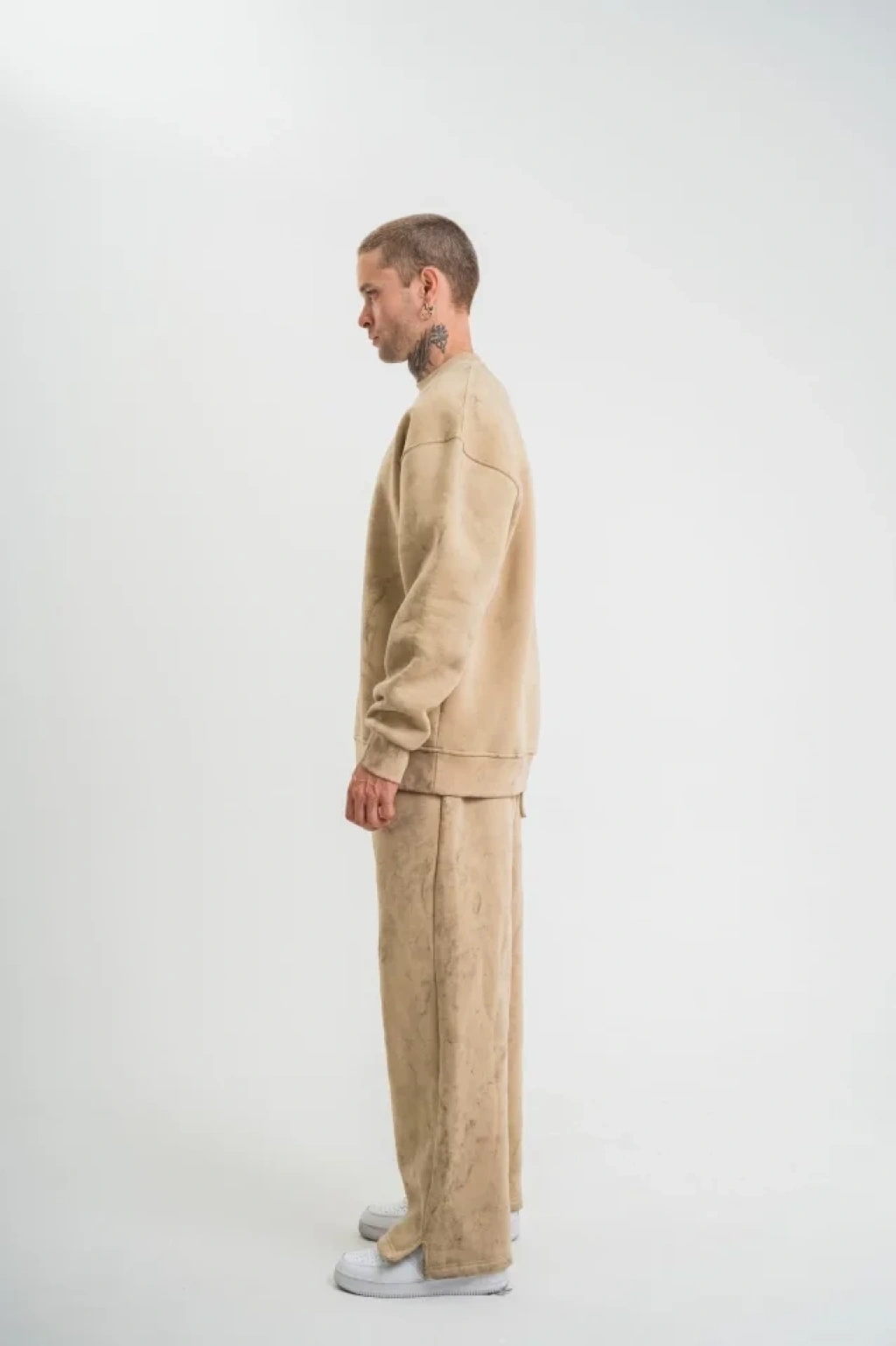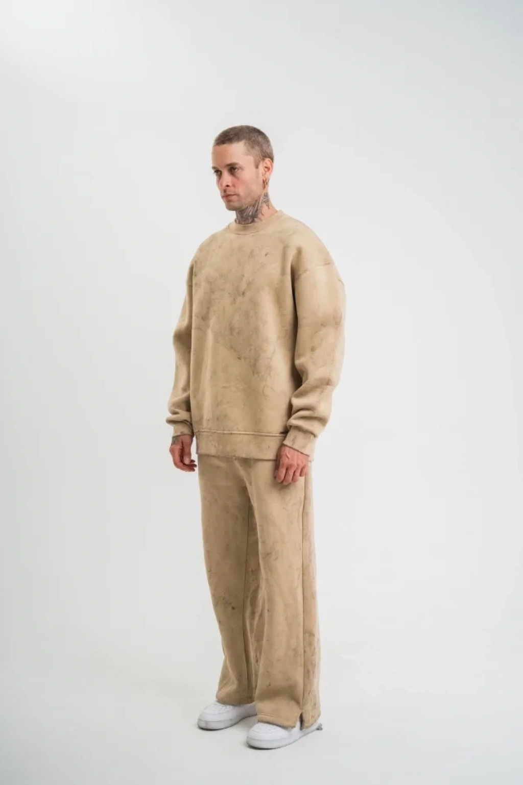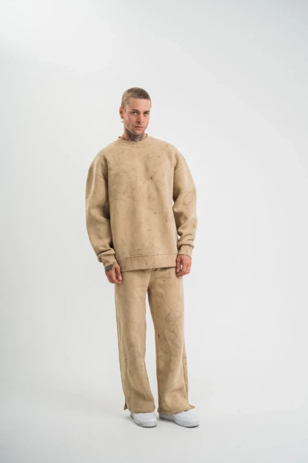 Unisex Uzun Kol Bisiklet Yaka Yıkamalı Eşofman Takım Bej