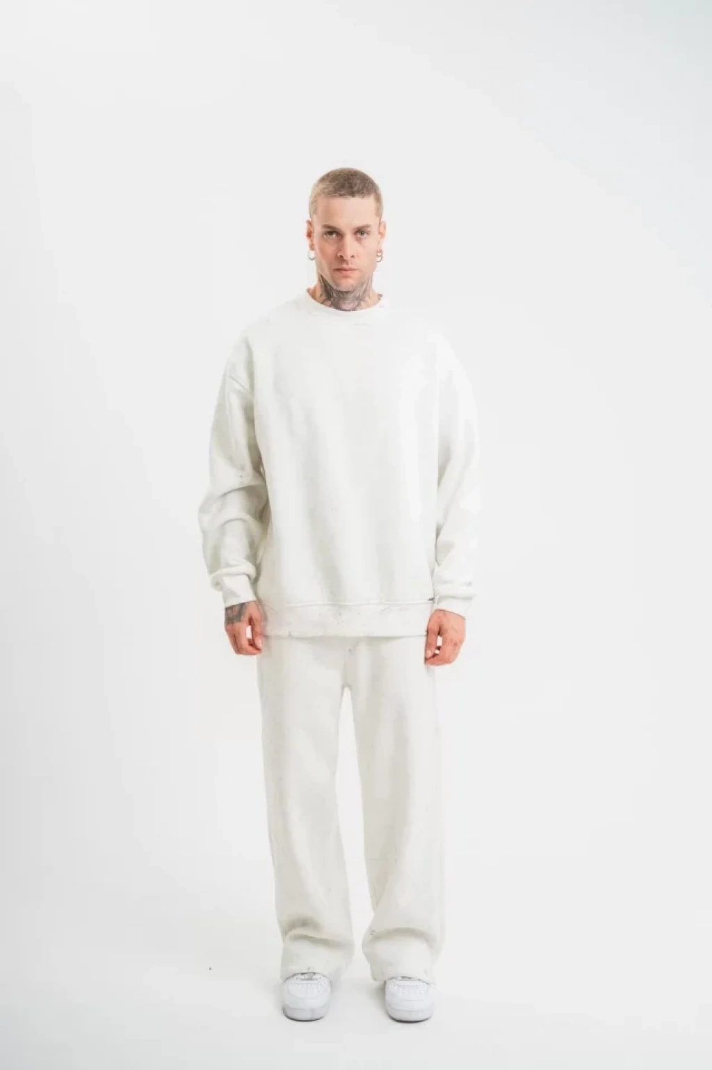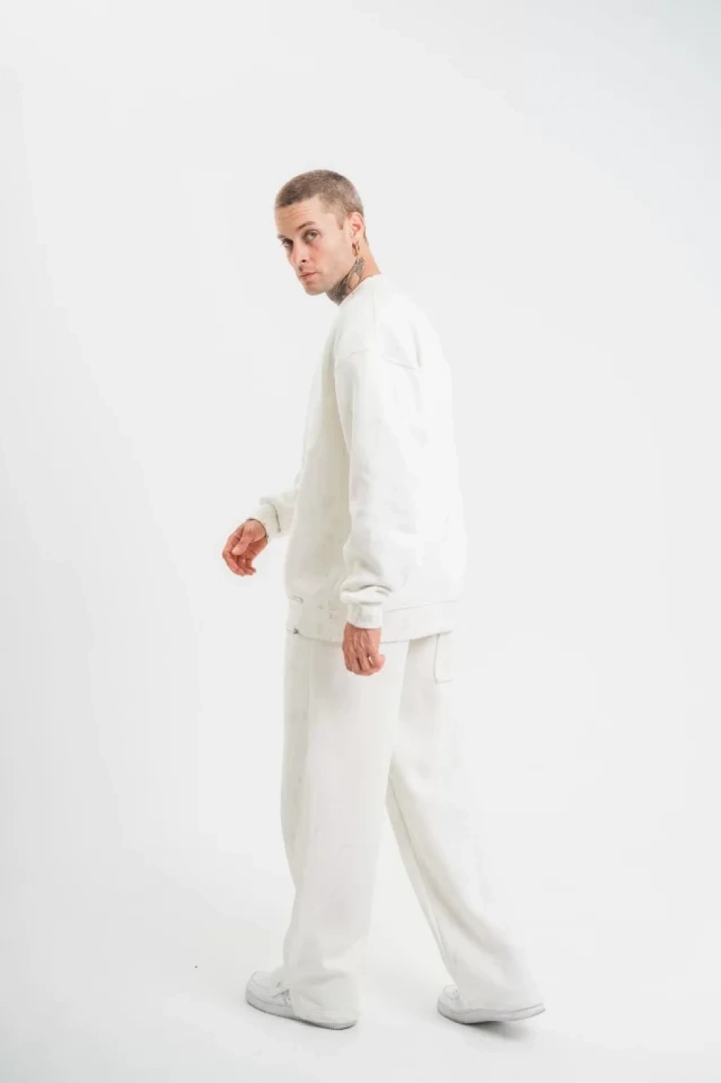 Unisex Uzun Kol Bisiklet Yaka Yıkamalı Eşofman Takım - Beyaz