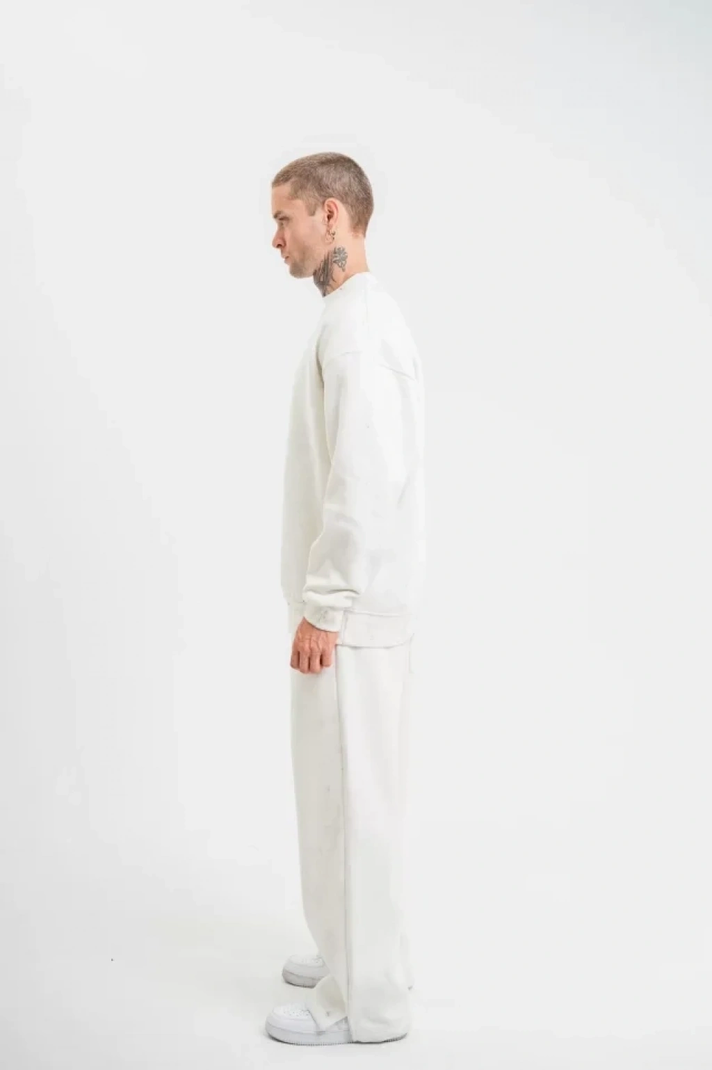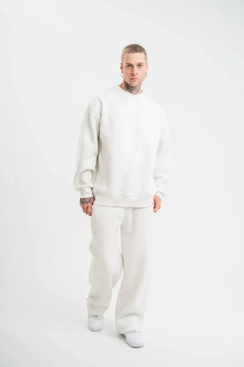 Unisex Uzun Kol Bisiklet Yaka Yıkamalı Eşofman Takım Beyaz