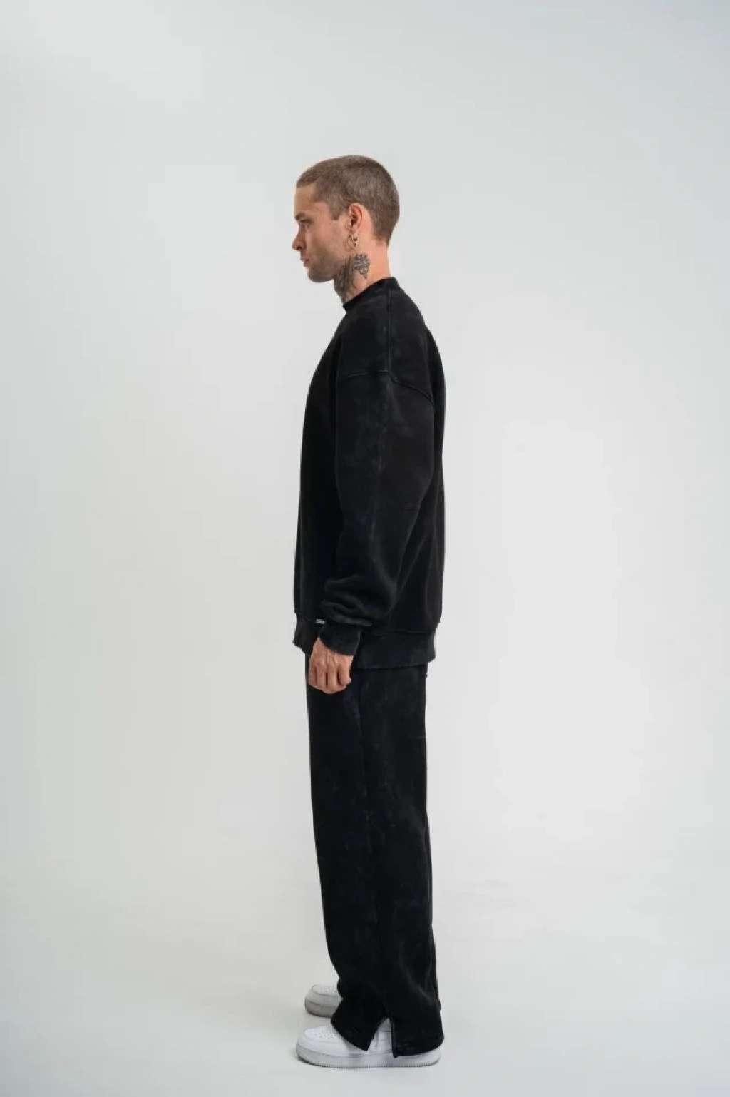 Unisex Uzun Kol Bisiklet Yaka Yıkamalı Eşofman Takım - Siyah
