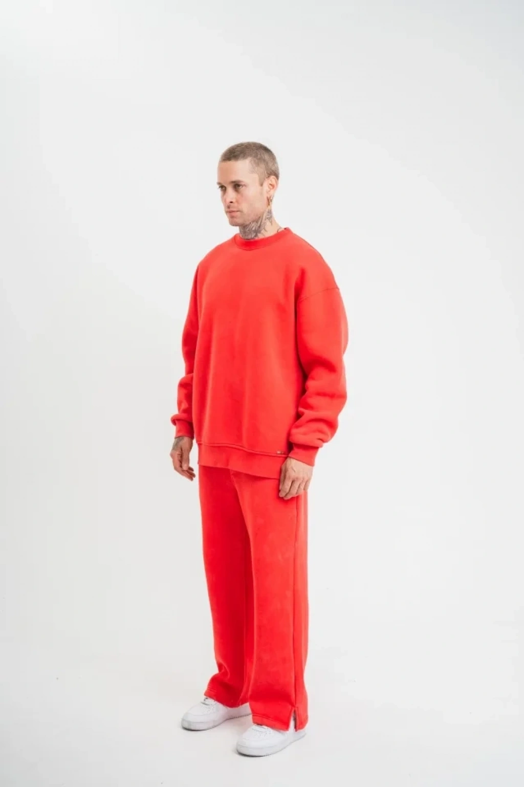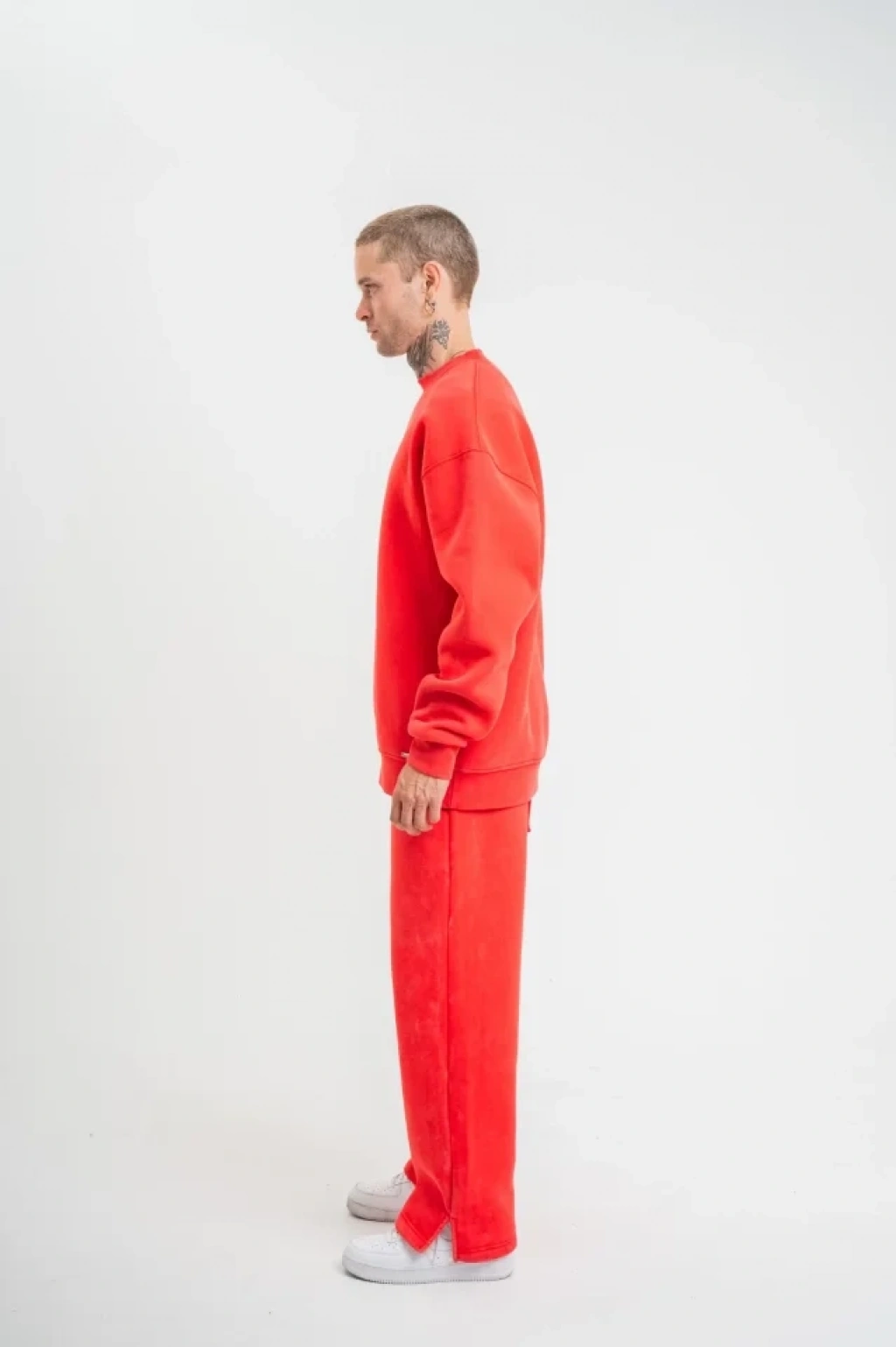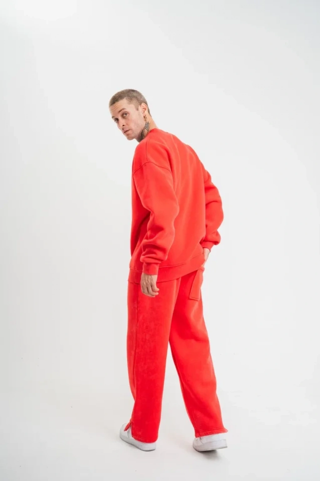 Unisex Uzun Kol Bisiklet Yaka Yıkamalı Eşofman Takım Kırmızı