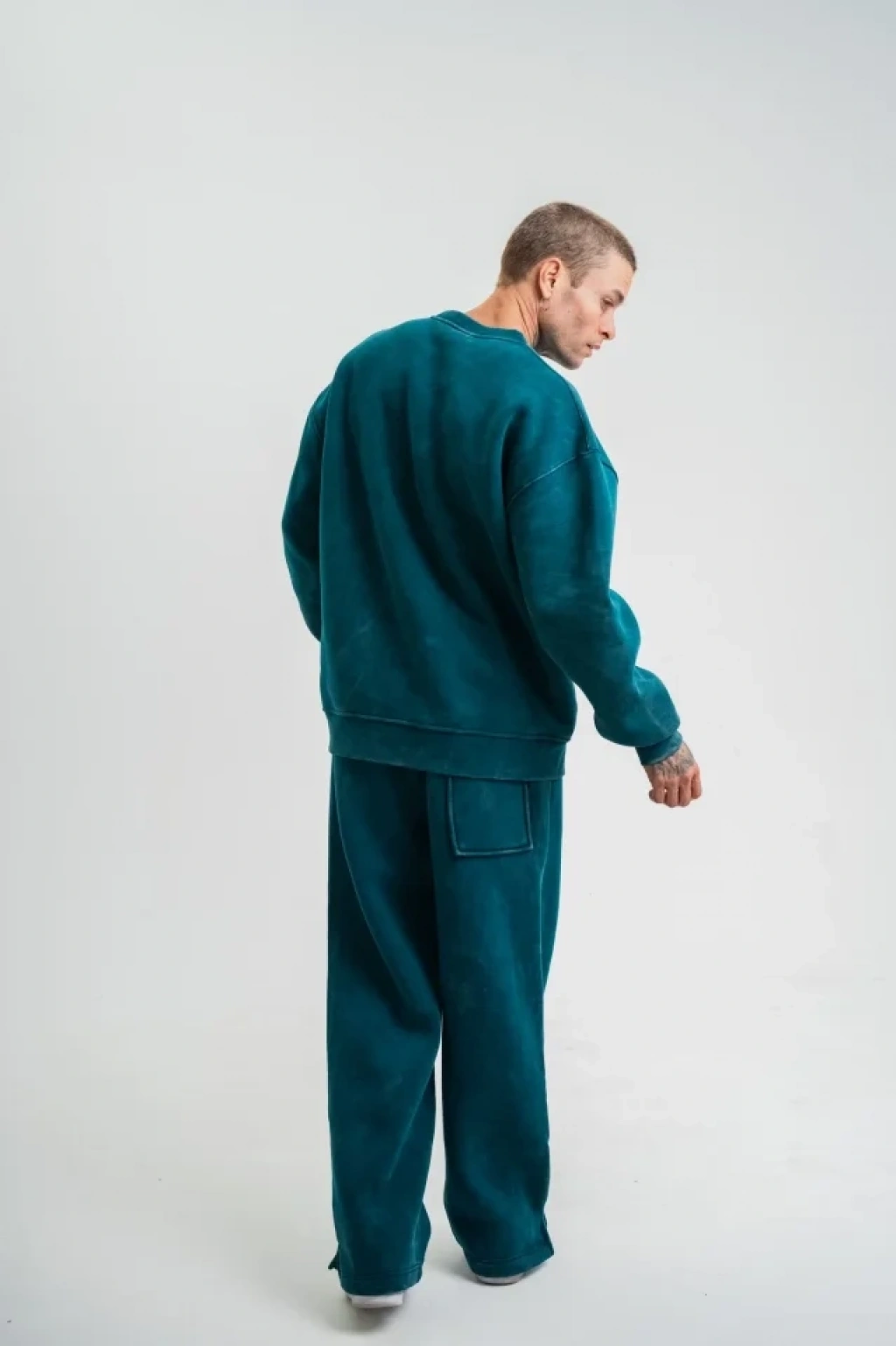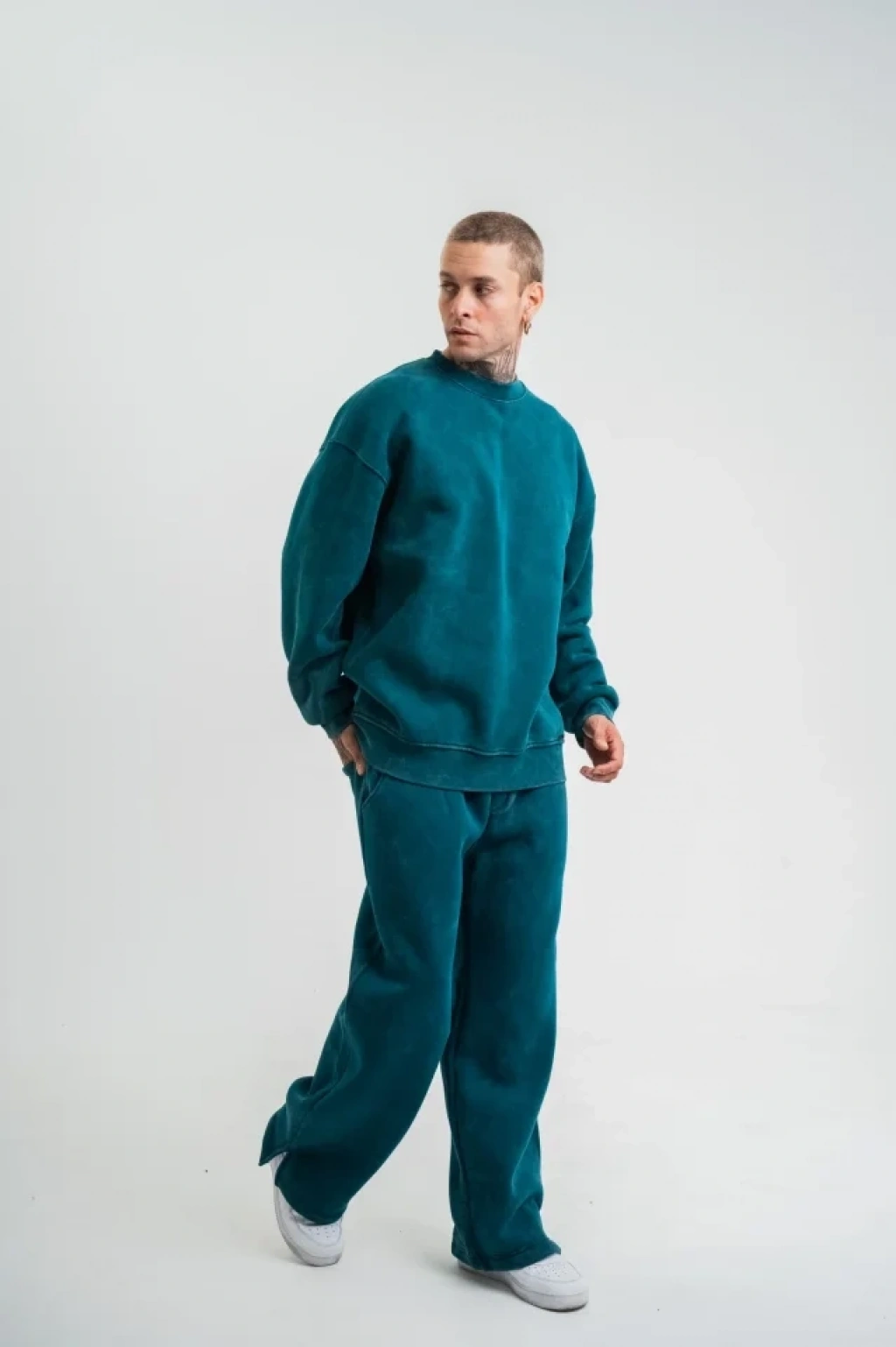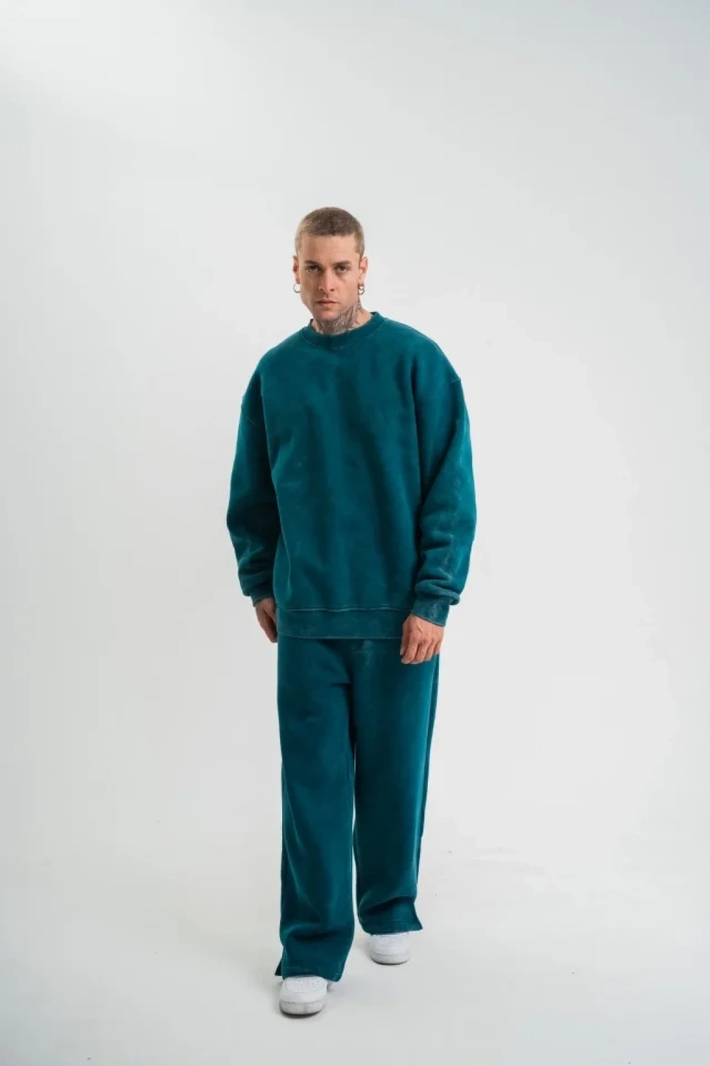 Unisex Uzun Kol Bisiklet Yaka Yıkamalı Eşofman Takım - Koyu Deniz Yeşili