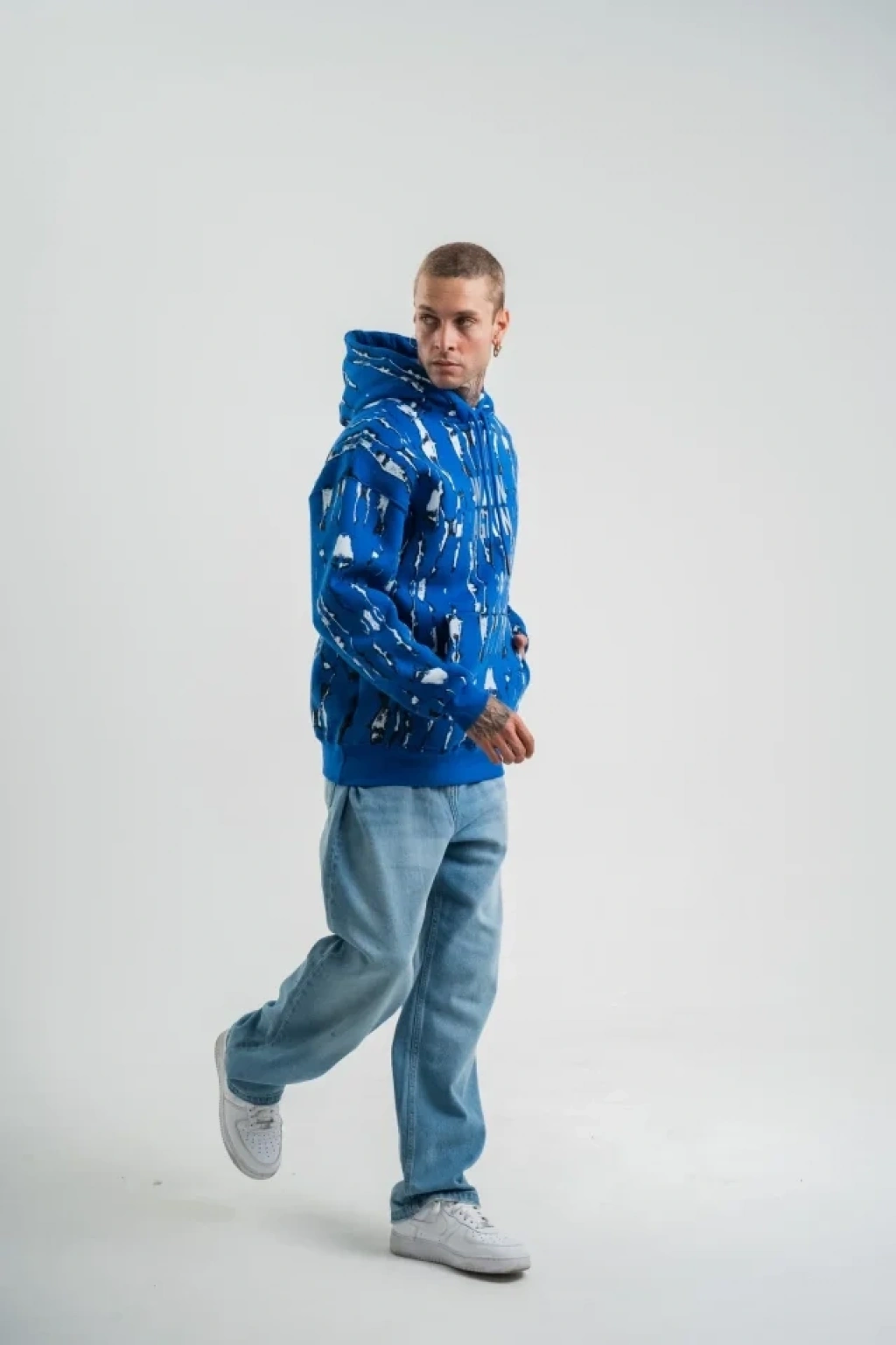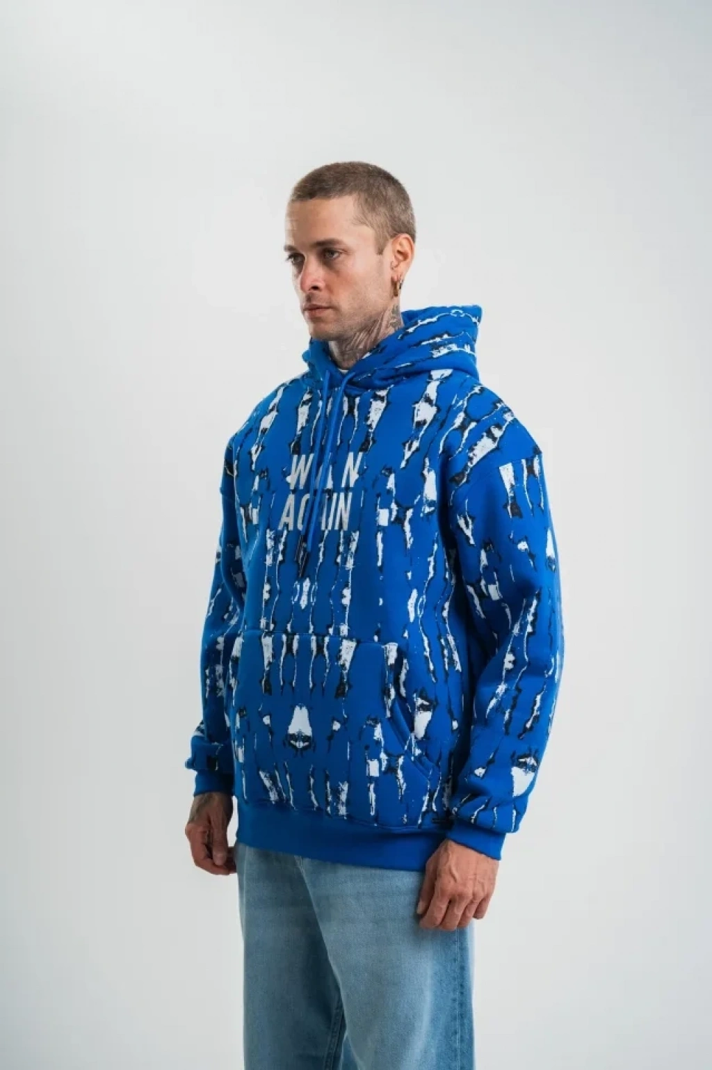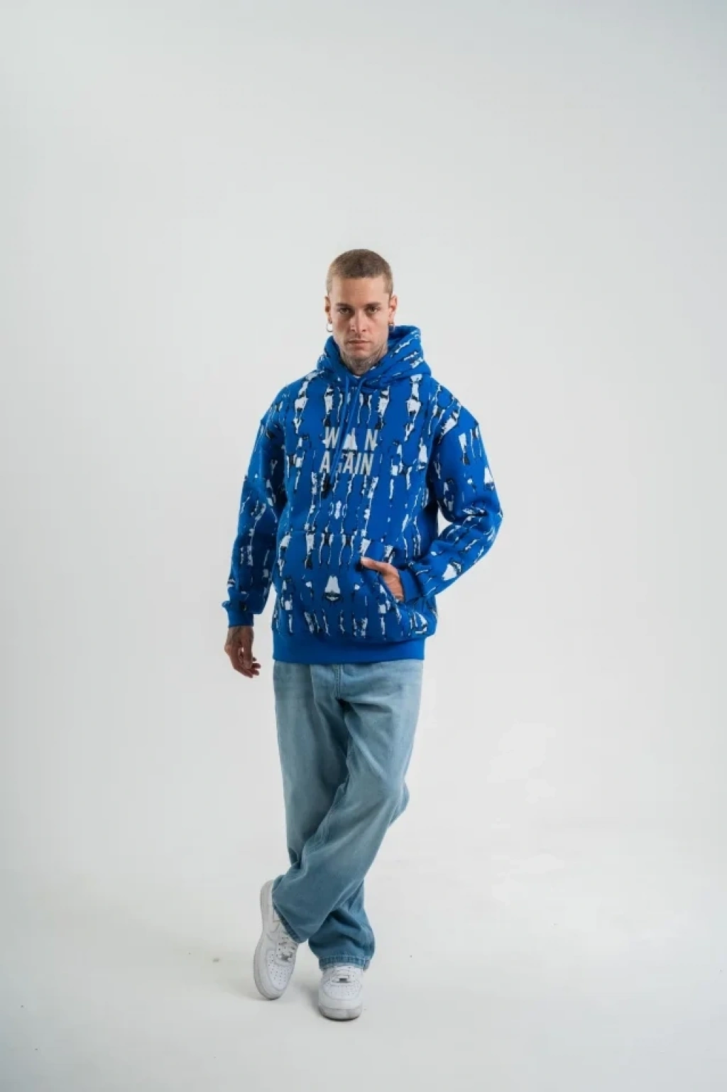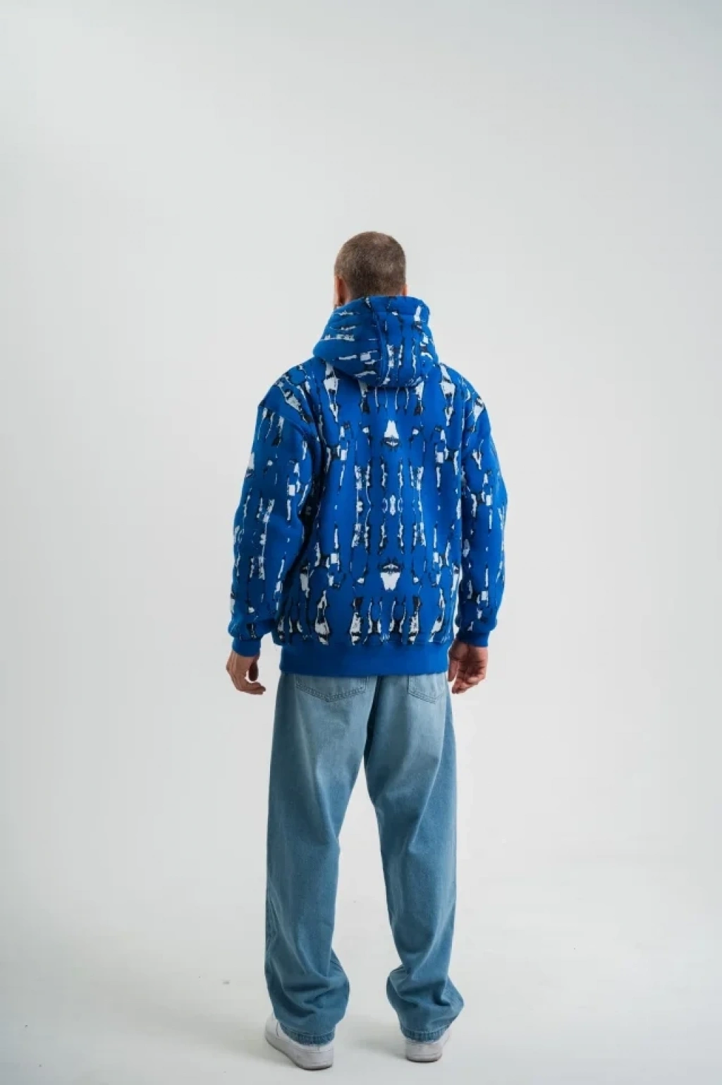 Unisex Uzun Kol Kapşonlu Pano Baskılı SweatShirt - Mavi