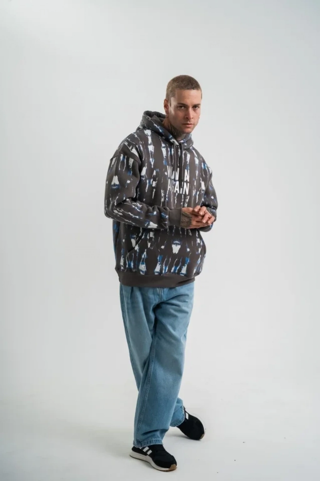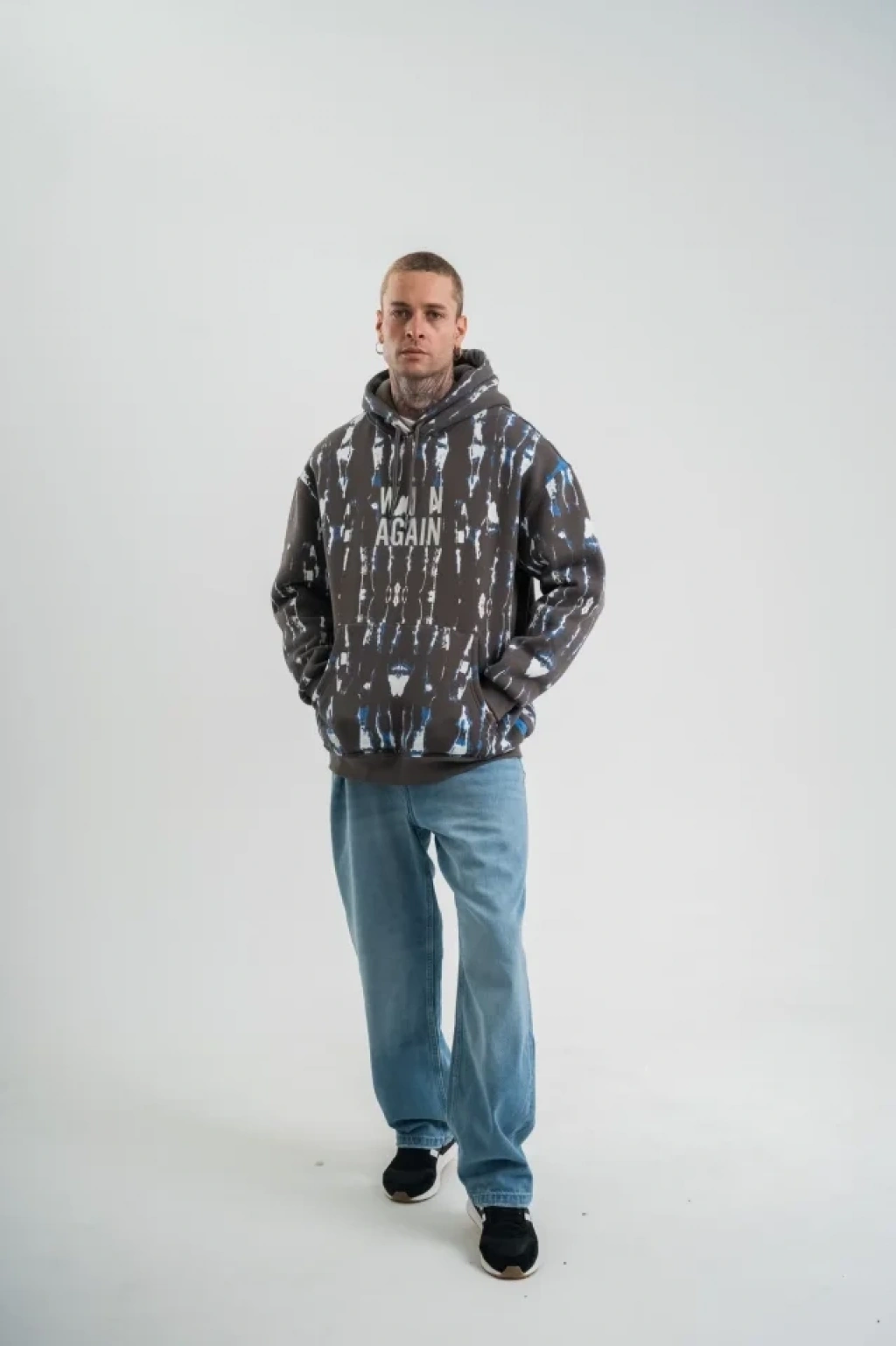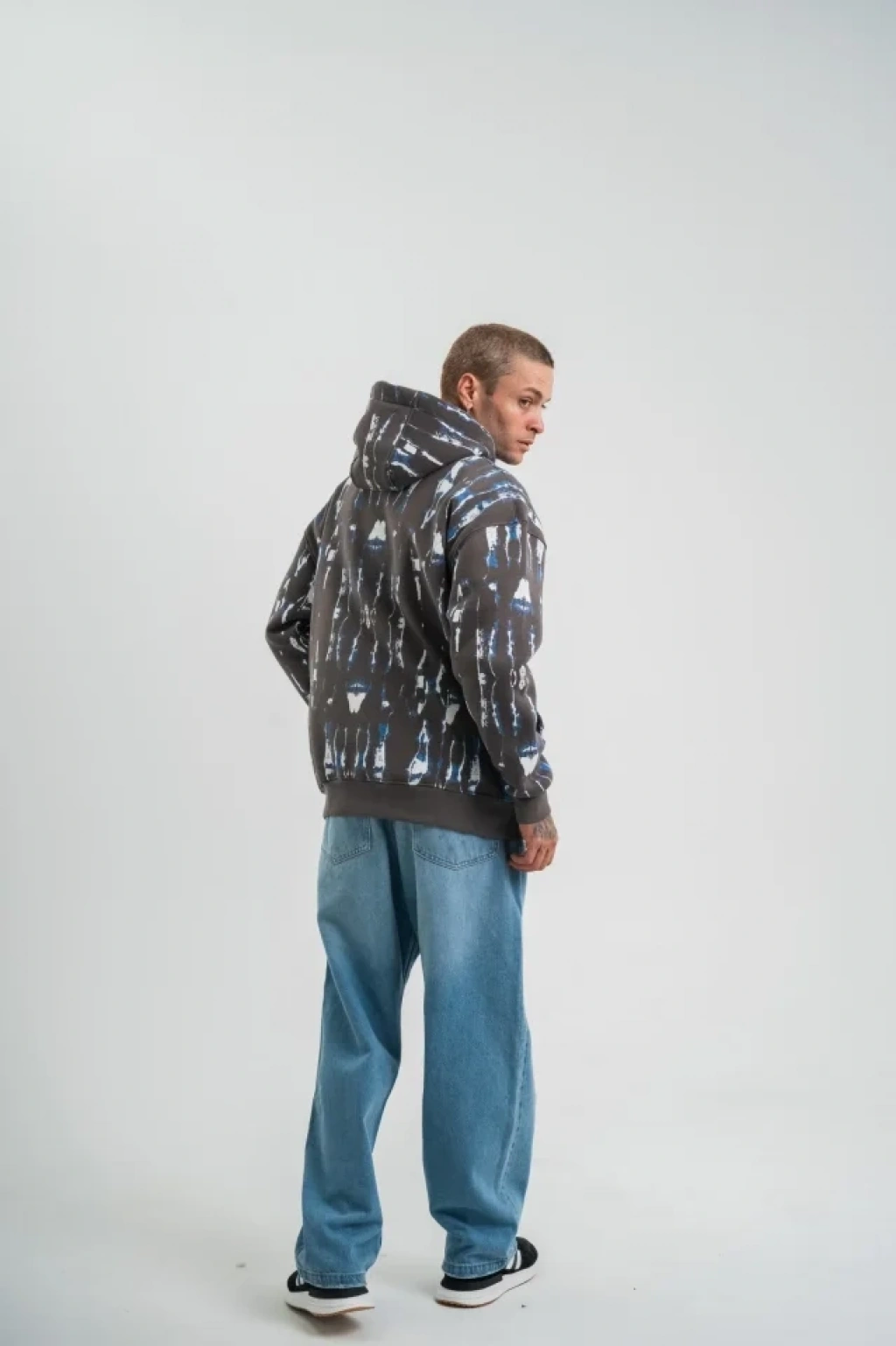 Unisex Uzun Kol Kapşonlu Pano Baskılı weathirt Füme
