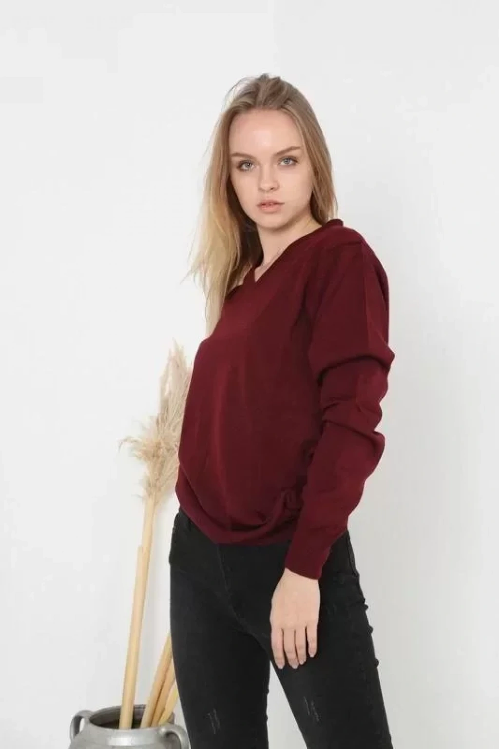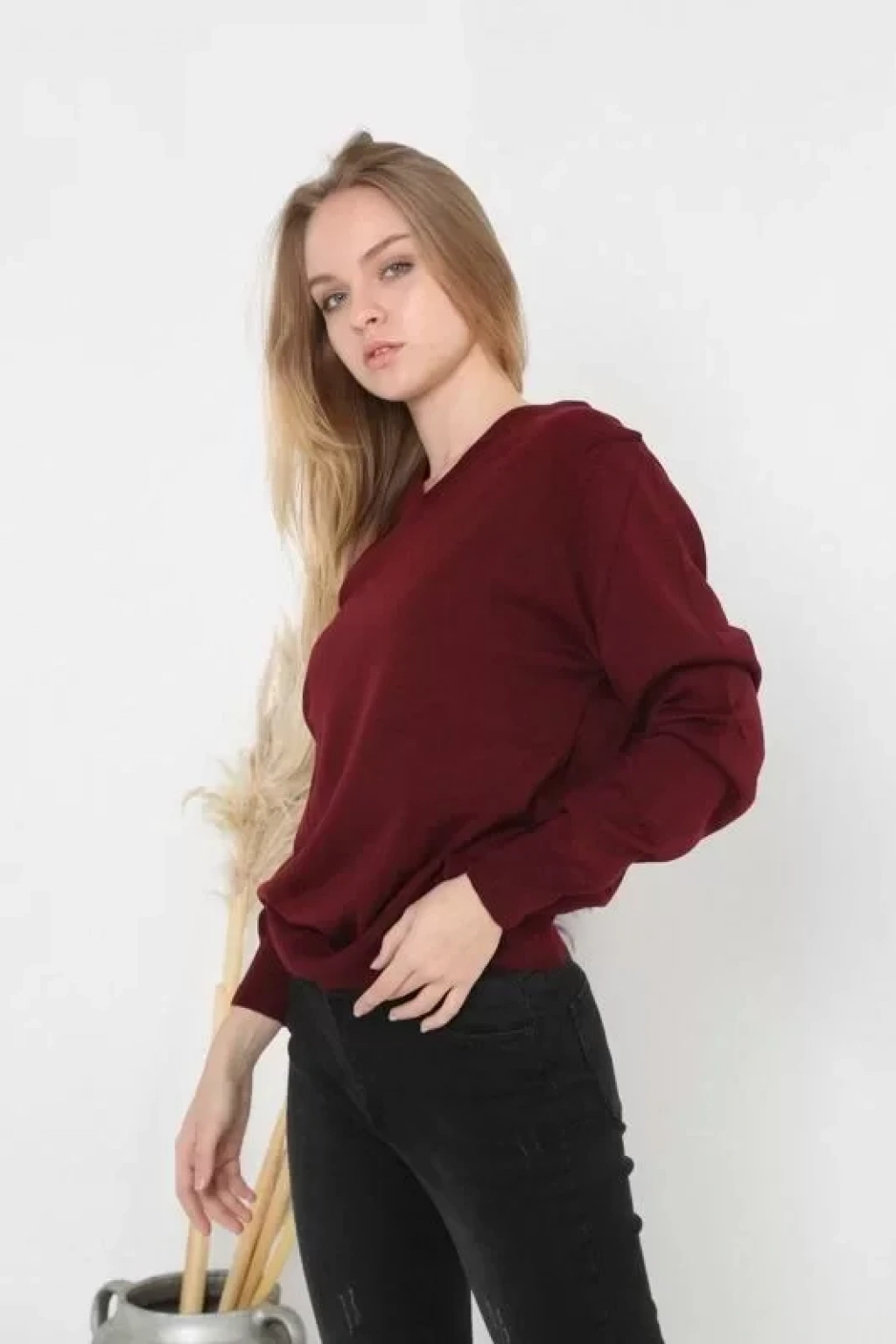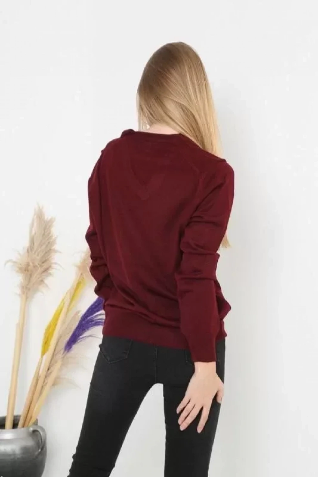 Unisex Uzun Kol V Yaka Triko Kazak - Bordo
