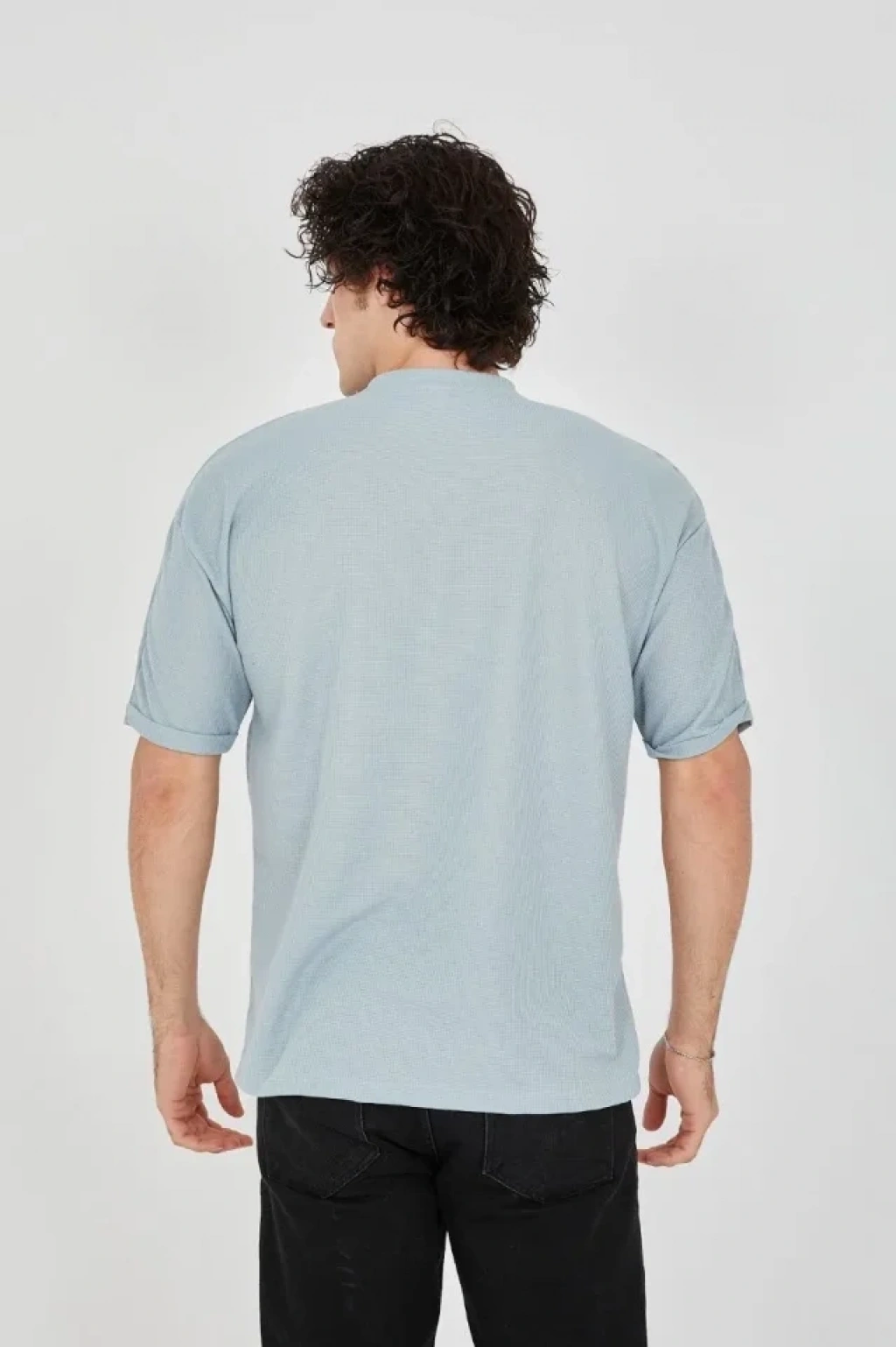 Unisex Waffle Kumaş Rahat Kol T-Shirt - Buz Mavisi