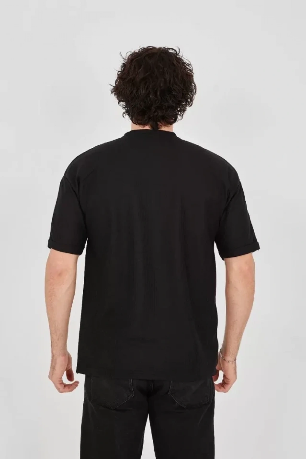 Unisex Waffle Kumaş Rahat Kol T-Shirt - Siyah