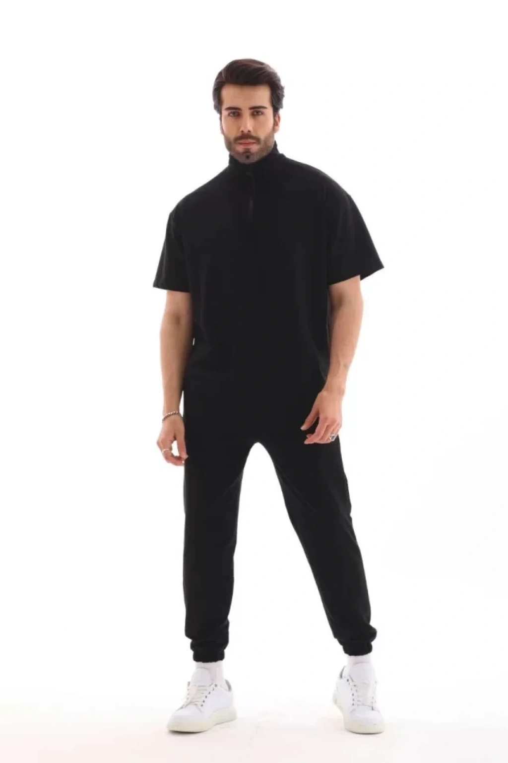 Unisex Yakalı Oversize T-Shirt Eşofmanlı Takım - Siyah
