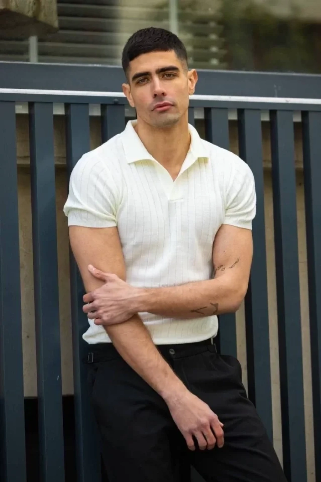 Erkek Fermuarlı Yaka Fitilli Triko Kısa Kollu Regular Fit Tişört Tshirt Beyaz