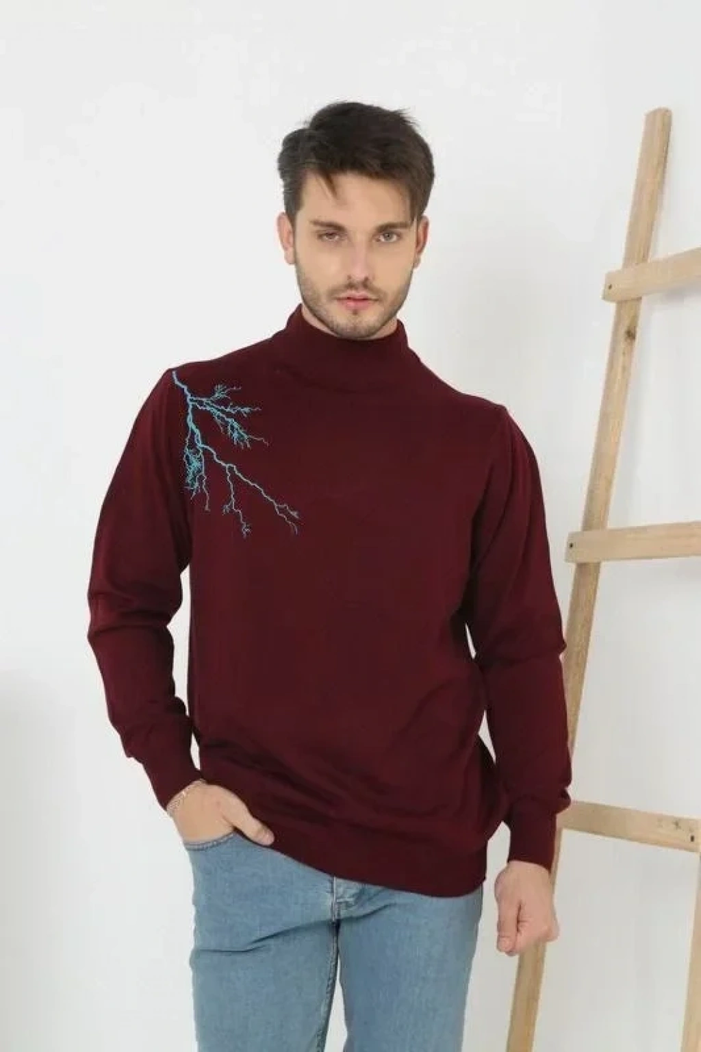 Unisex Yarım Boğazlı Baskılı Dokuma Triko Bordo