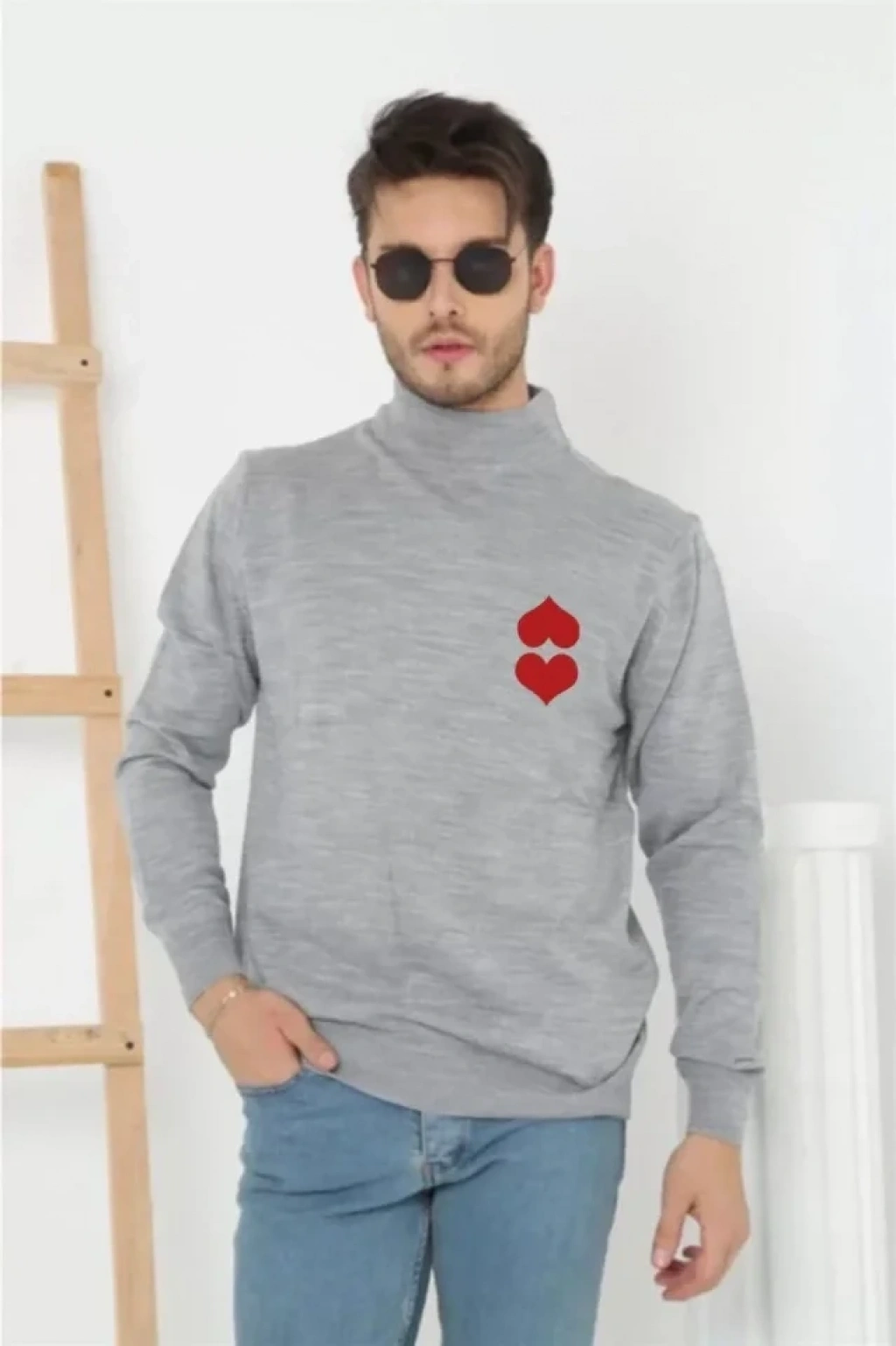Unisex Yarım Boğazlı Baskılı Dokuma Triko Gri