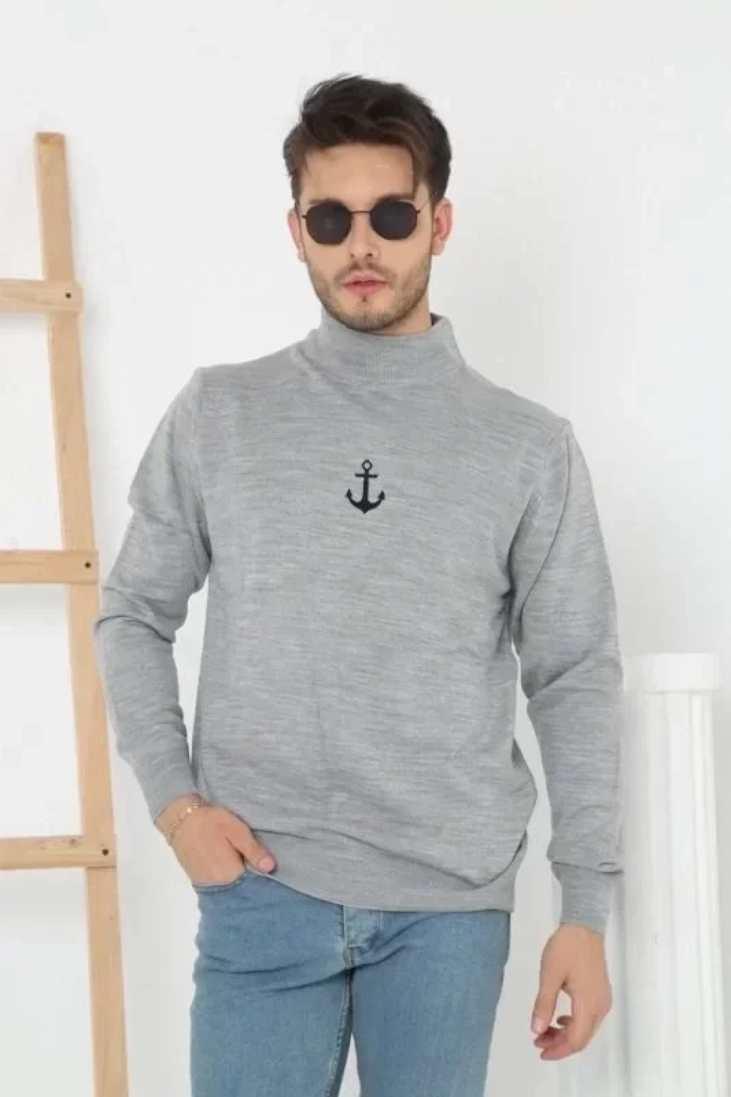 Unisex Yarım Boğazlı Baskılı Dokuma Triko Gri