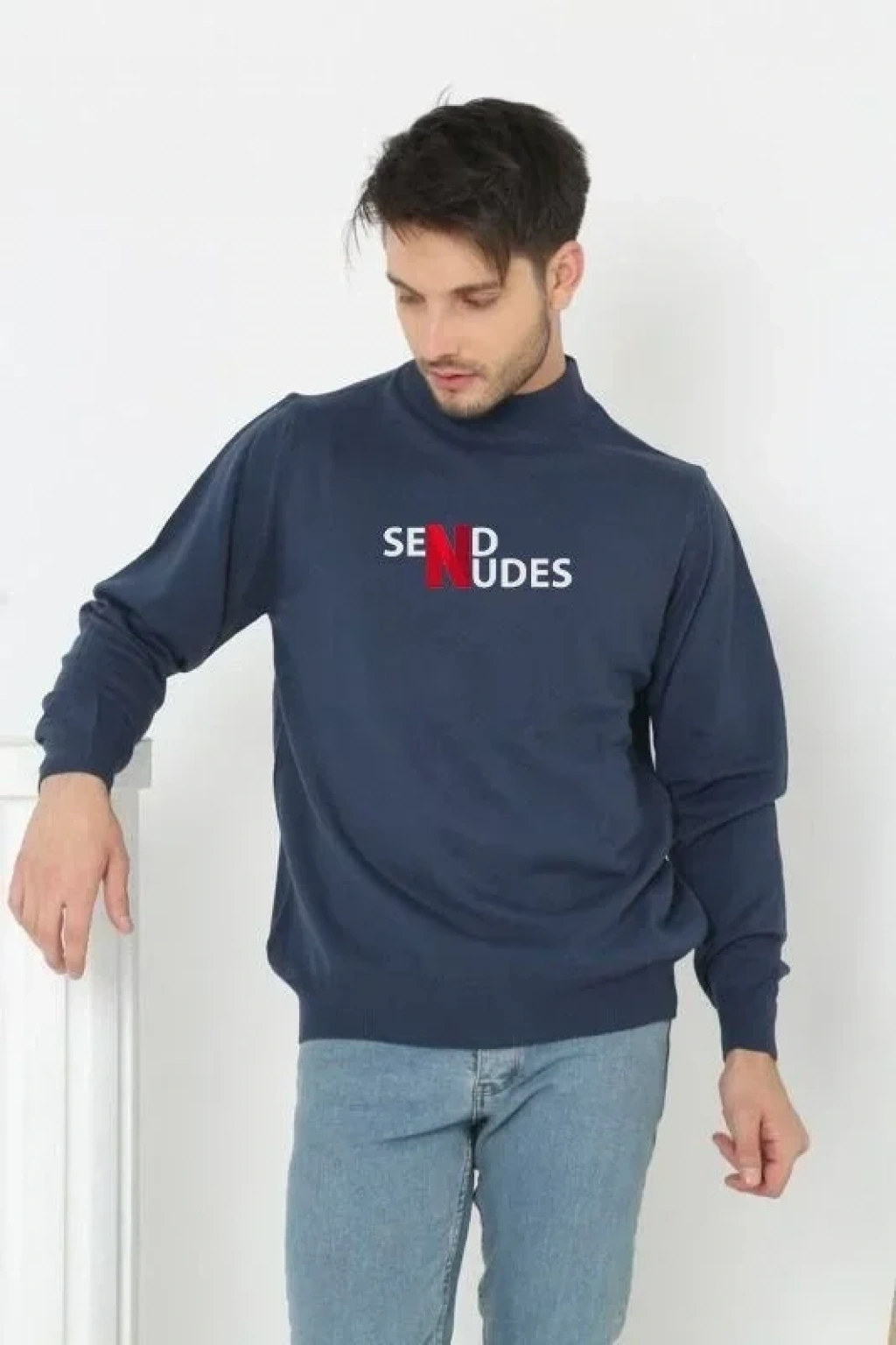 Unisex Yarım Boğazlı Baskılı Dokuma Triko Indigo