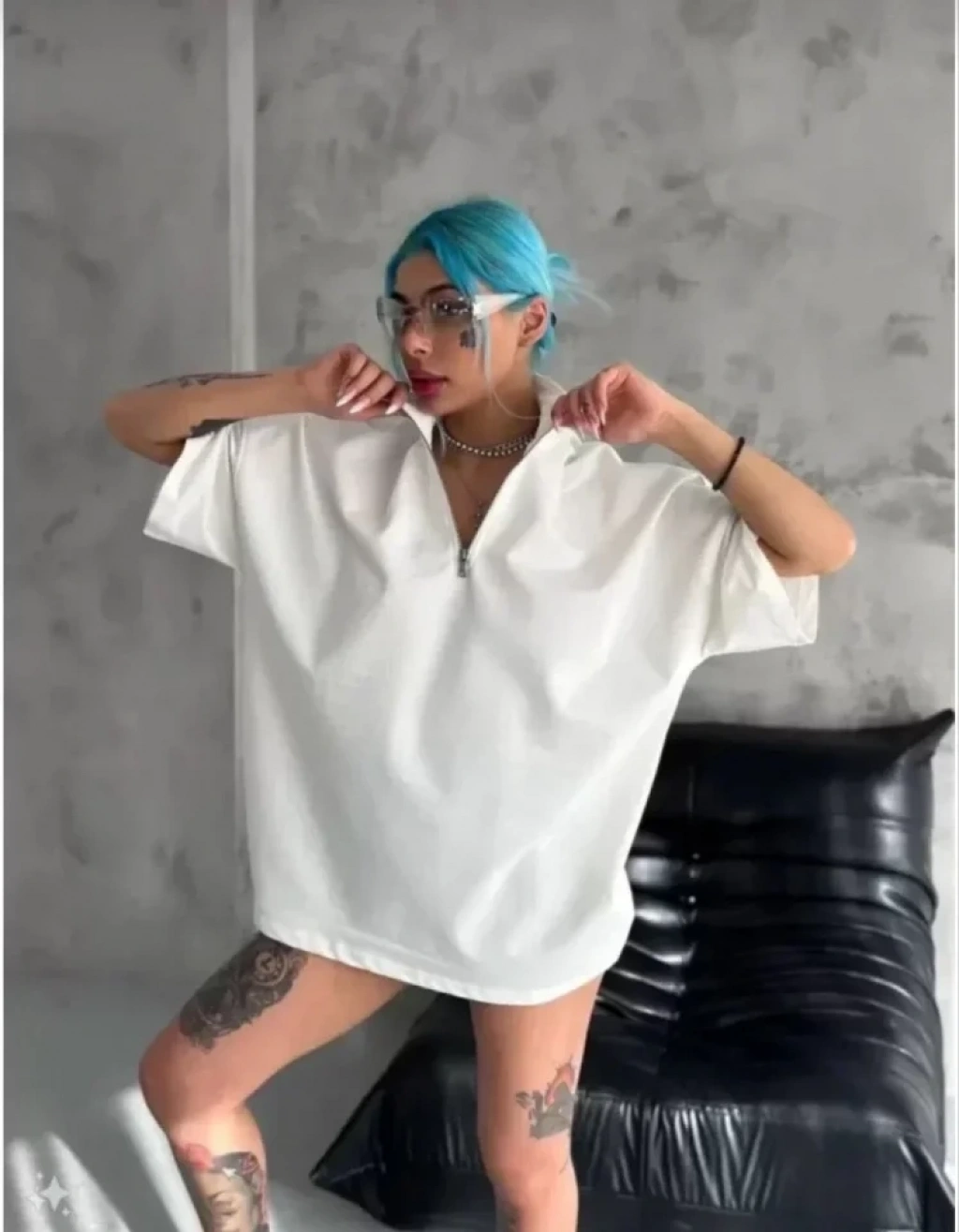 Unisex Yarım Fermuarlı Düz Oversize T-Shirt - Beyaz