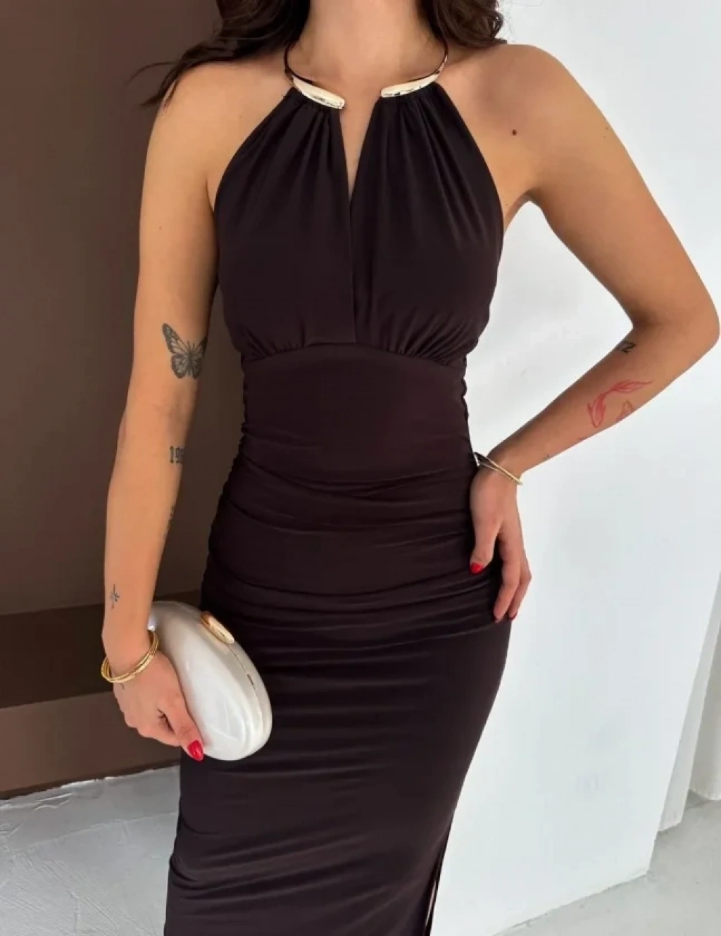 Uzun Abiye Elbise Yırtmaçlı Sırt Dekolteli Şık Gece Elbisesi - Kahverengi