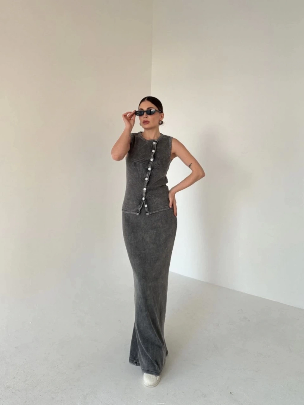 Uzun Etekli Önü Düğmeli Badi İkili Takım- Antrasit