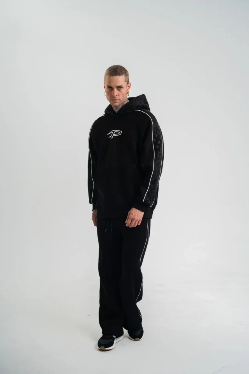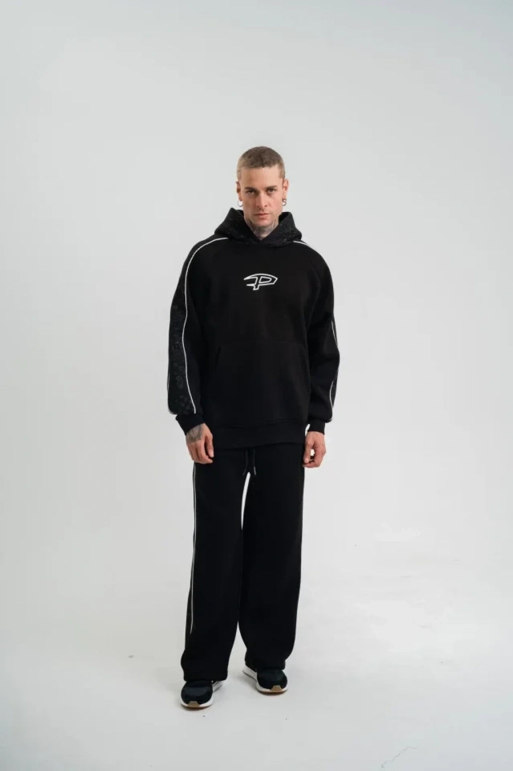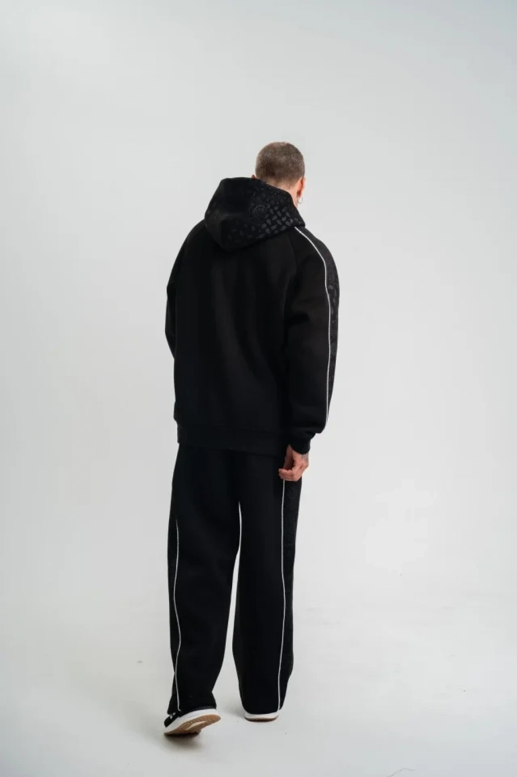 Uzun Kol Kapşonlu Ara Biyeli Baggy Eşofman Takım - Siyah