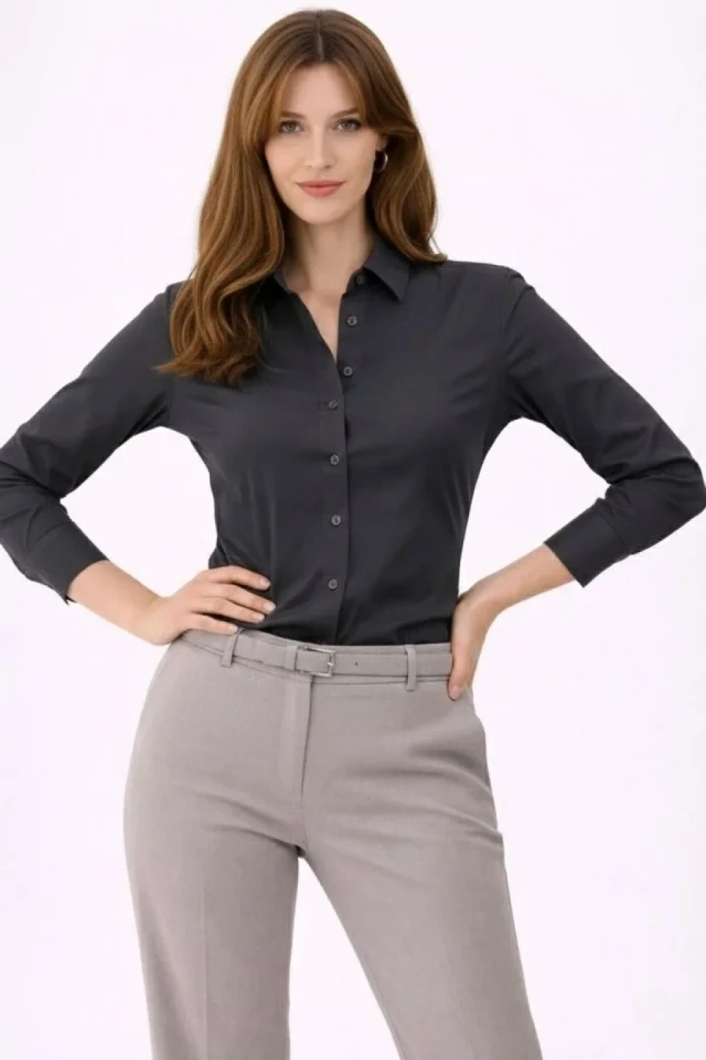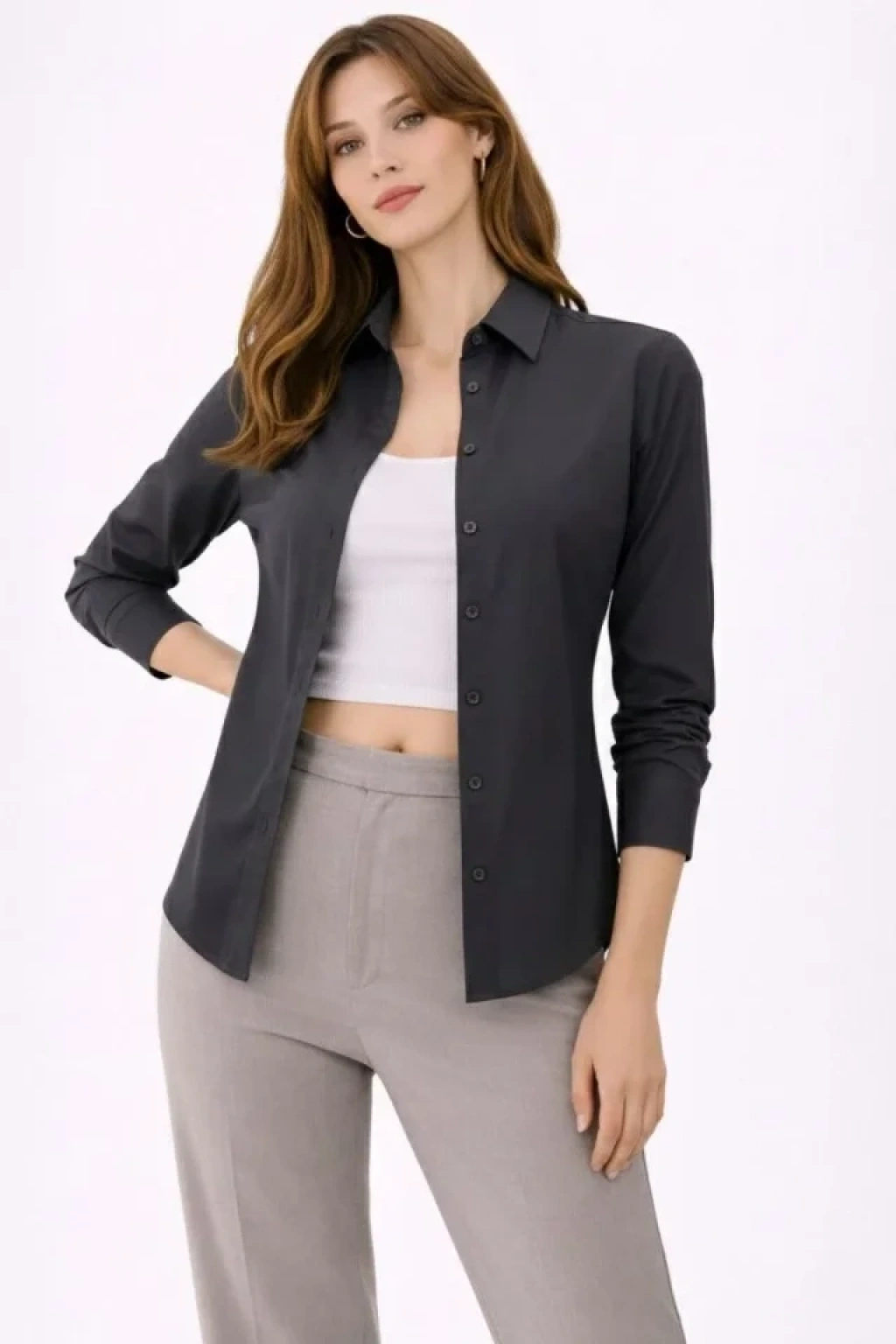 Uzun Kollu Gömlek Düğmeli Klasik Yaka Günlük Ve Ofis Şıklığına Uygun - Füme