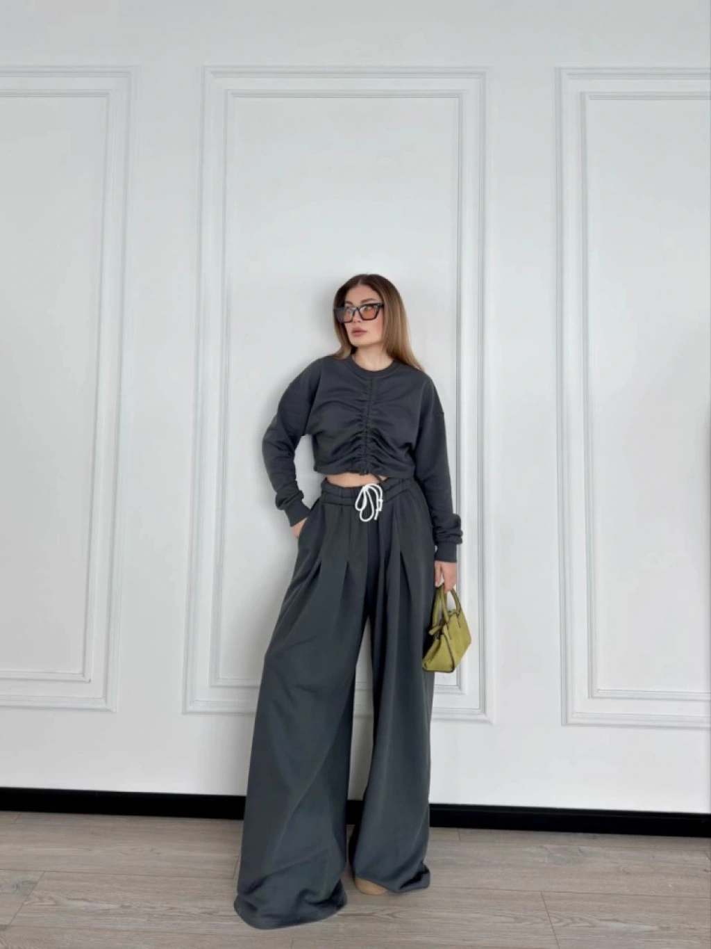 Uzun Kollu Önü İp Büzgülü Crop Ve Pantolon İkili Takım - Antrasit