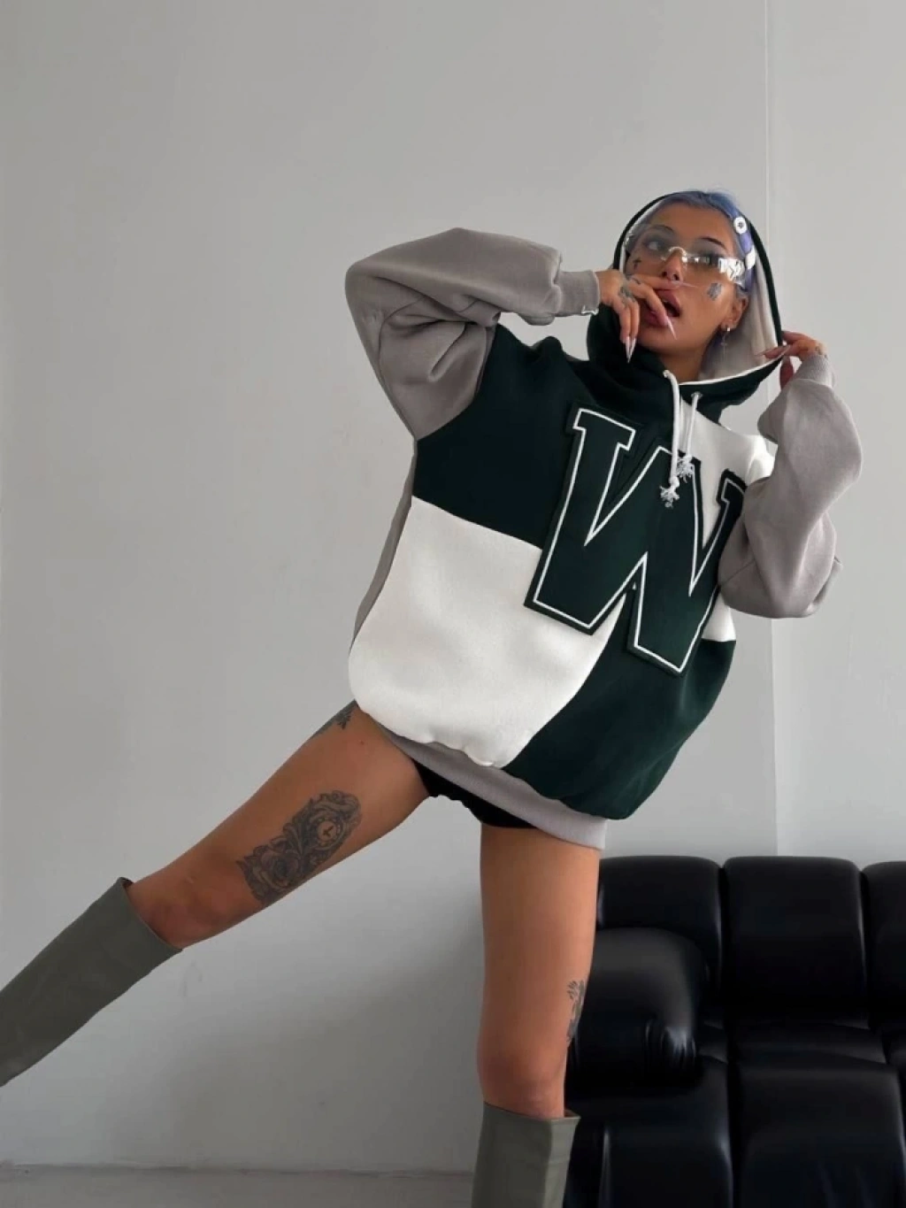 W Nakış İşlemeli Kapüşonlu Sweatshirt - Yeşil