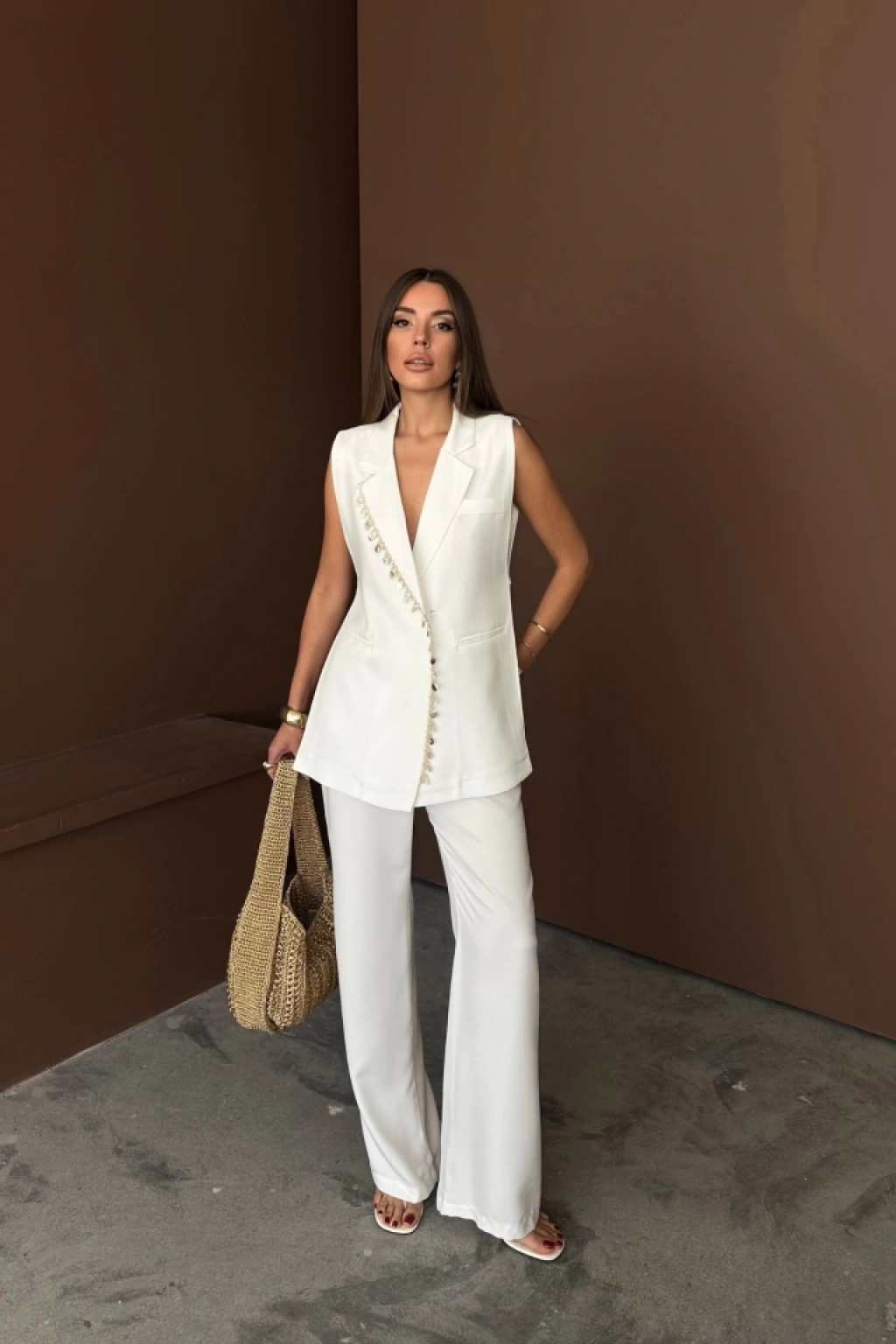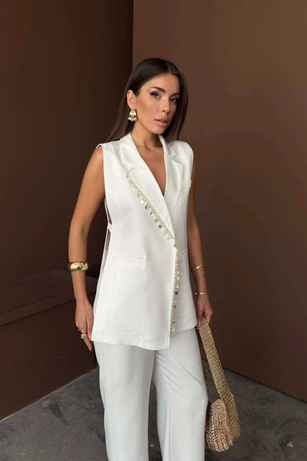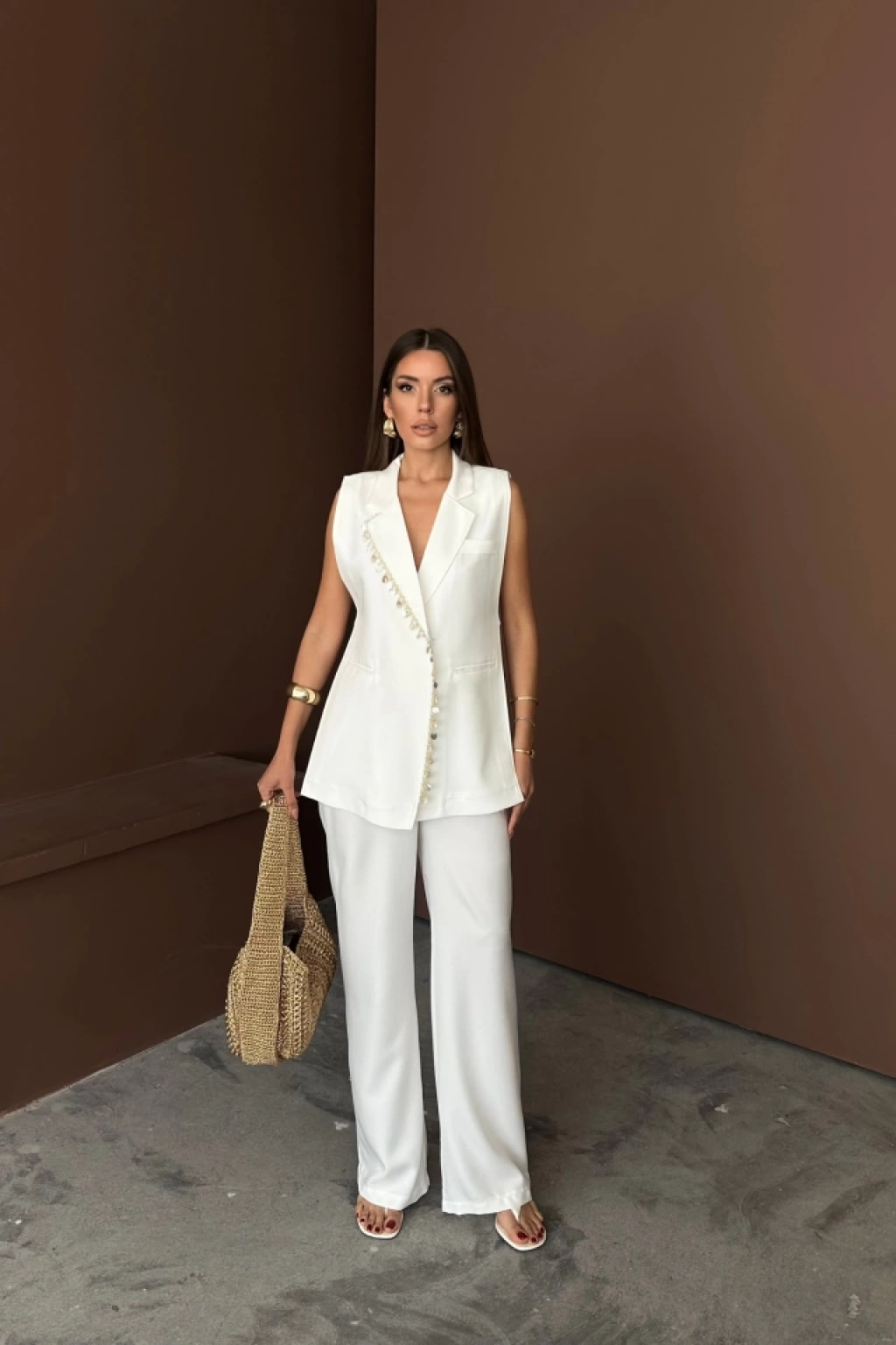 YAKA MİDYE KABUĞU SIRALI YELEK - PANTOLONTAKIM KETEN KUMAŞ - Beyaz