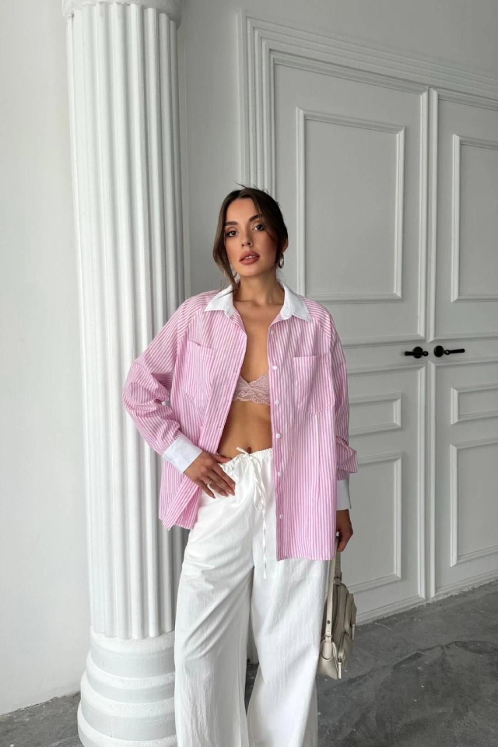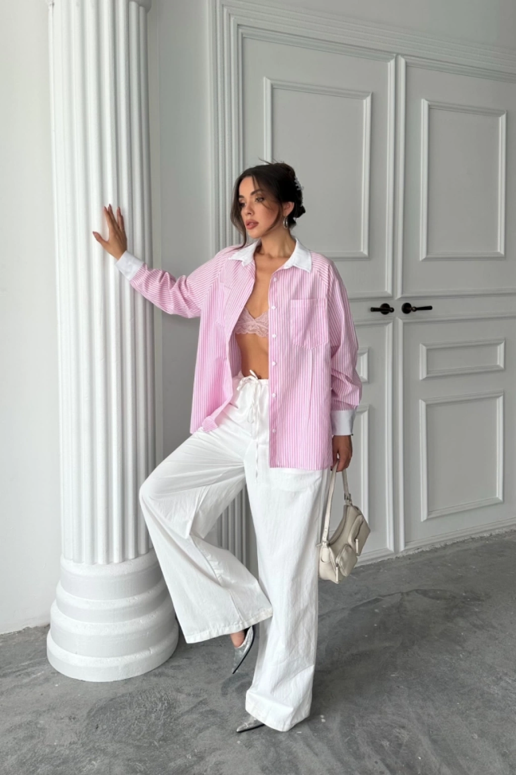 YAKA VE MANŞET BEYAZBOYFRİEND ÇİZGİLİPOPLİN GÖMLEK - Pembe