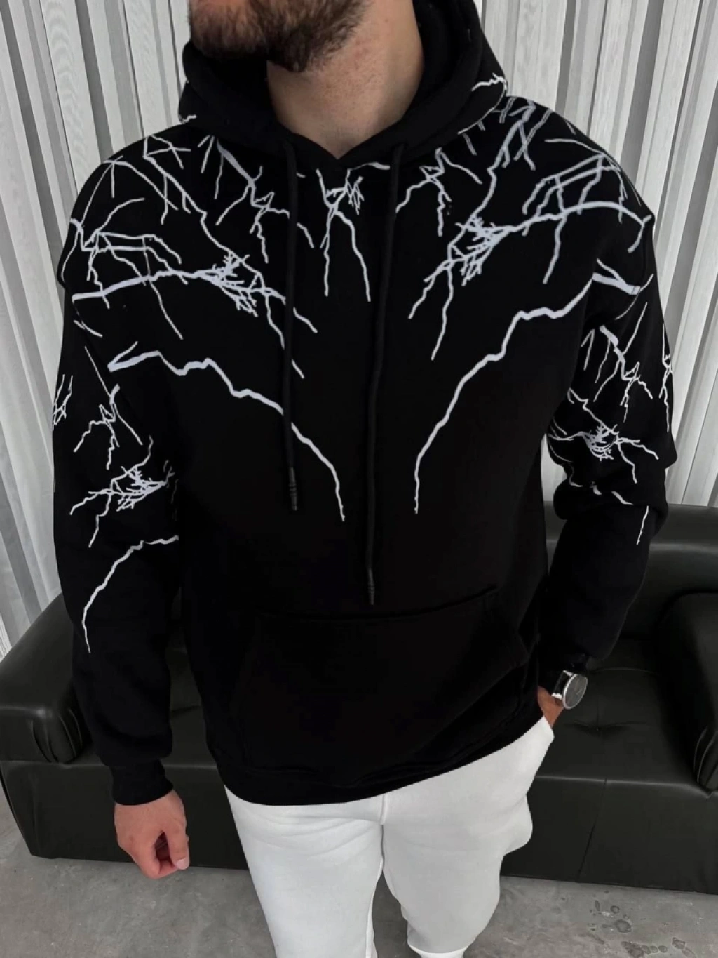 Yıldırım Baskılı Kapşonlu SweatShirt - Siyah