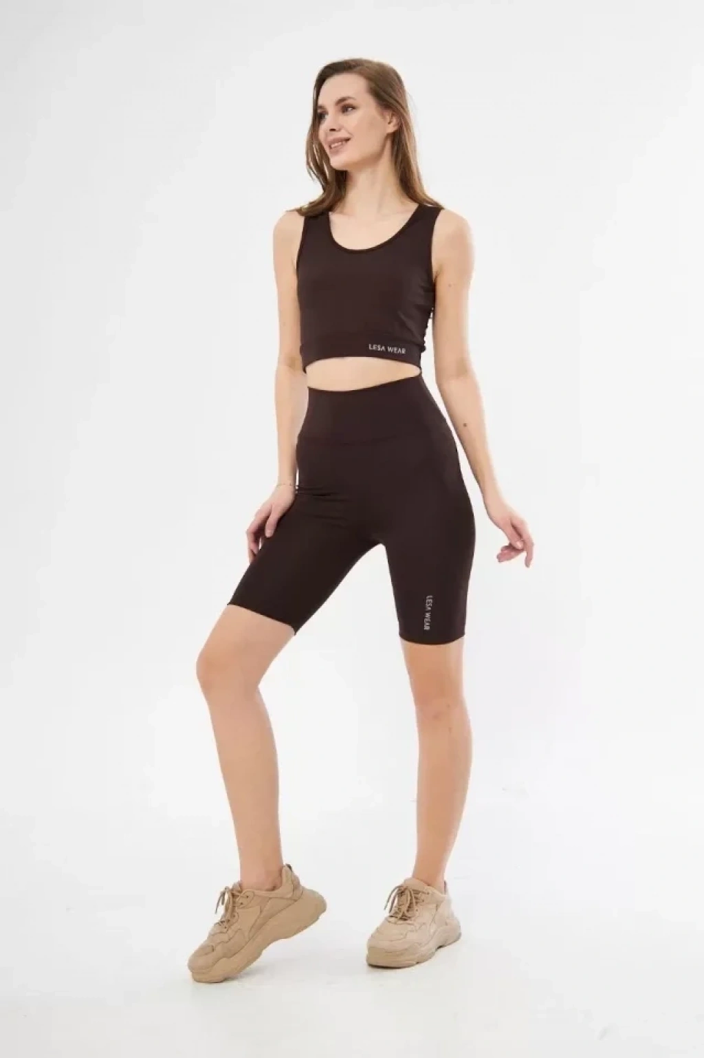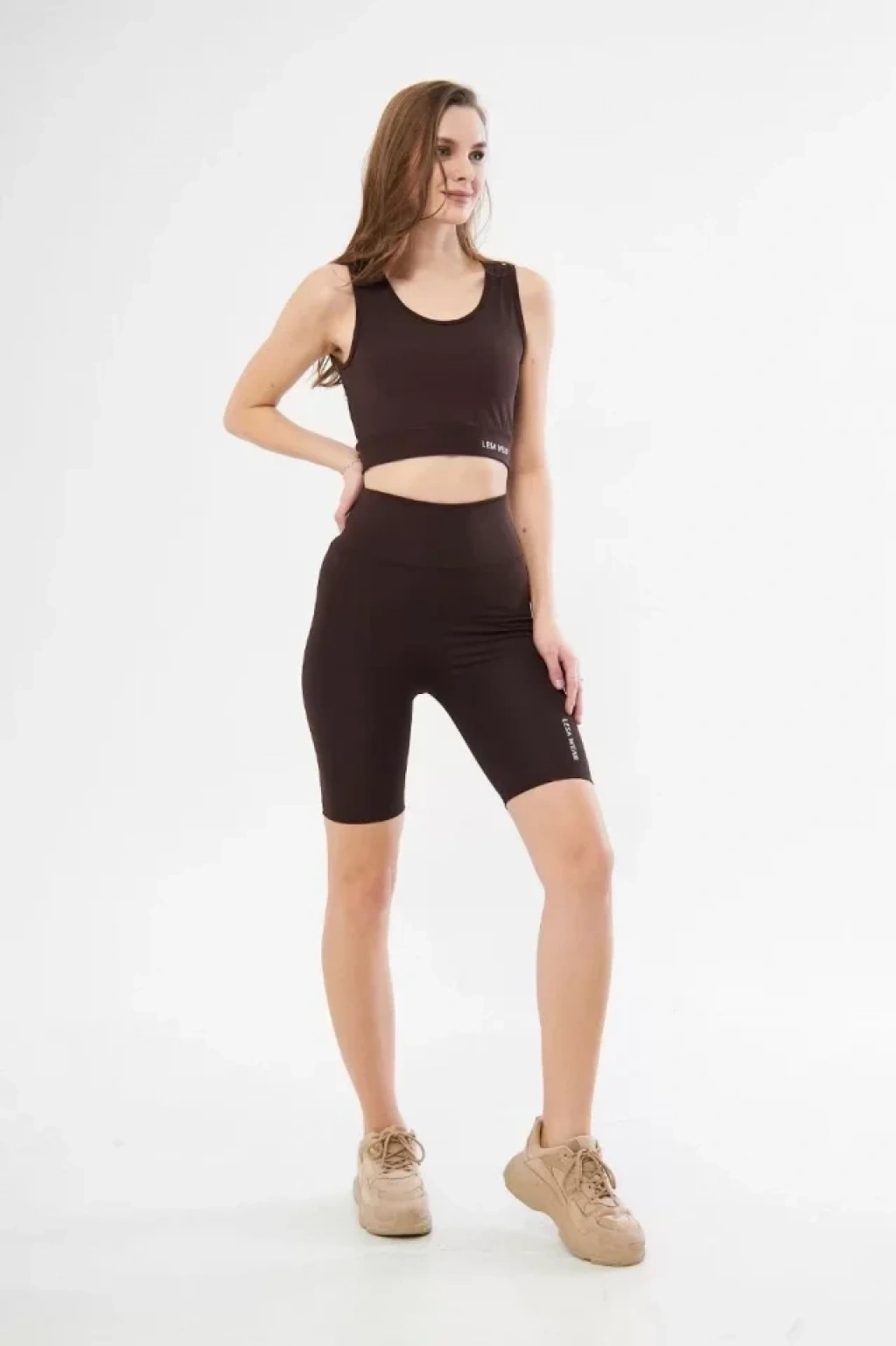 Yüksek Bel Dalgıç Croplu Biker Şortlu Takım - Kahve