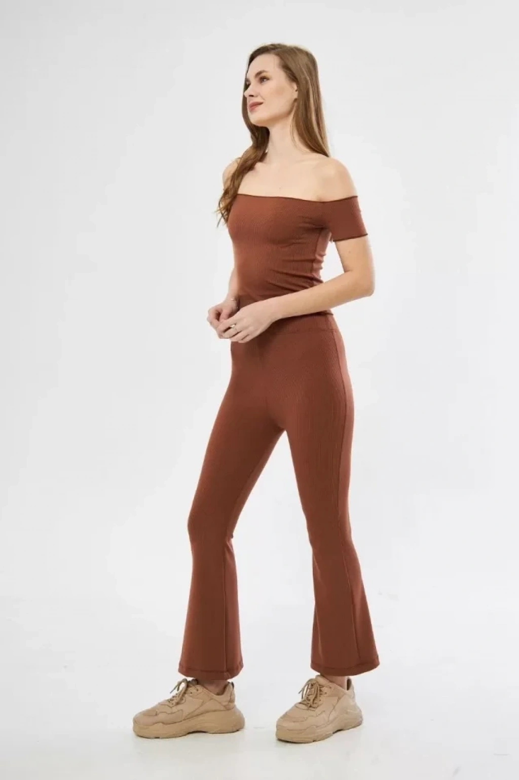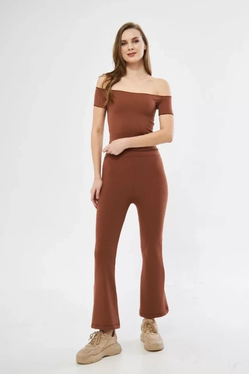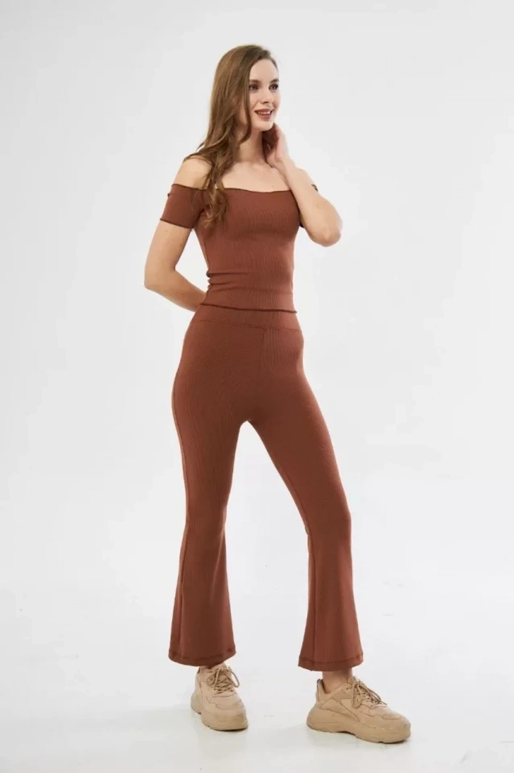 Yüksel Bel Fitilli İspanyol Paça Tayt Kahve
